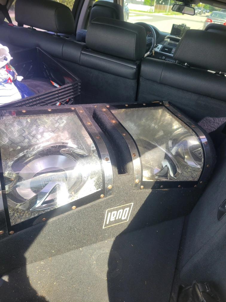 10Appears to be a dual subwoofer. Has cleat casing. Perfect for cruising down the road and listening to your favorite tunes.