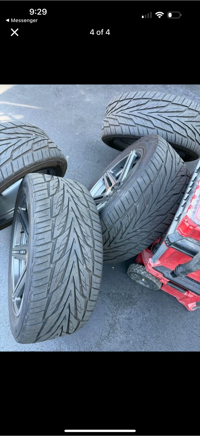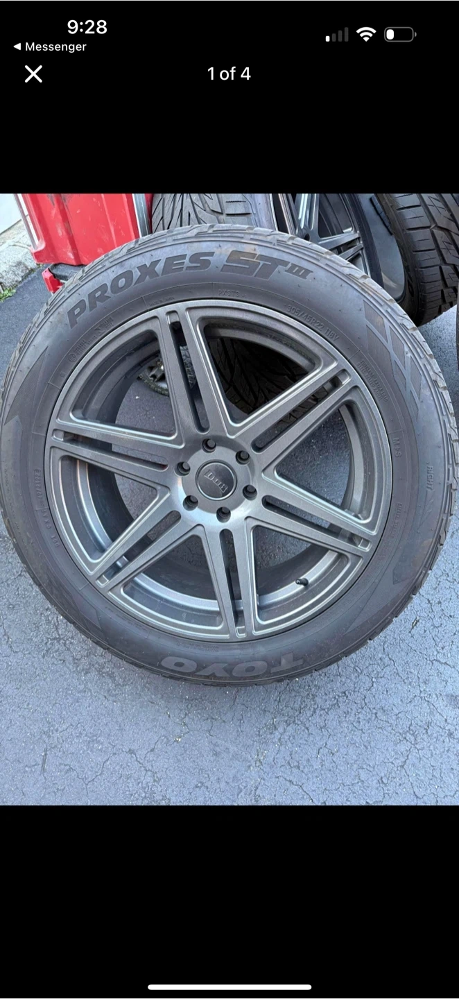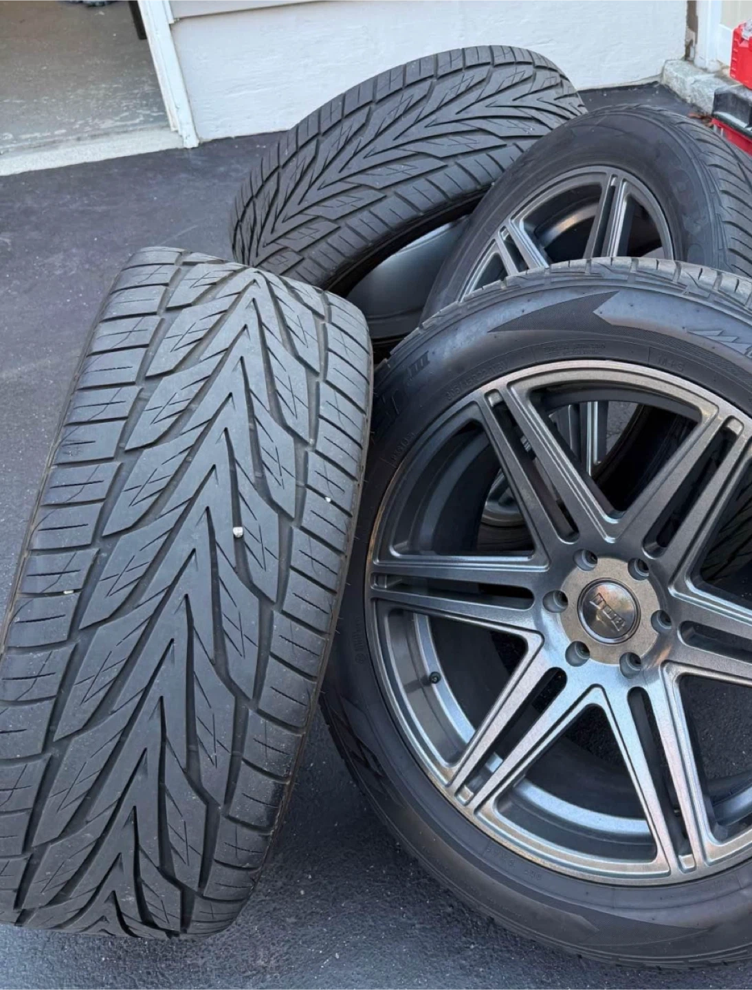 Selling a set of DUB 22x9.5 wheels paired with Toyo Proxes ST III tires. They're in like-new condition with no scratches or scuffs! The wheels are painted gray and have a 6x135 +25 offset.