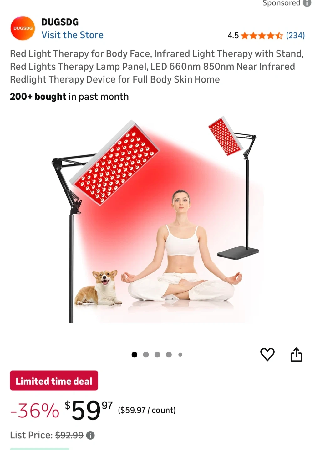 I'm selling a DUGSDG Red Light Therapy Lamp Panel. It's designed for full body skin health and can be used on both your face and body. It uses infrared light therapy with a stand. The panel features LED 660nm and 850nm near-infrared red light therapy. It comes new in the original box and a user manual. Pick up by Irving Park and Cumberland.
