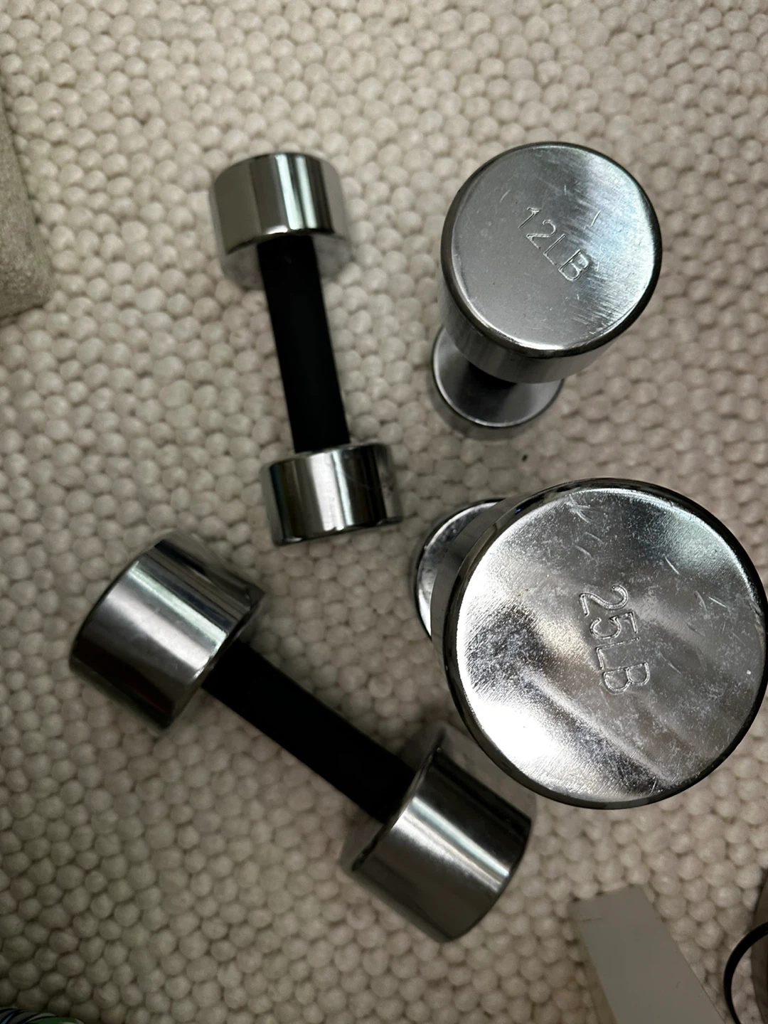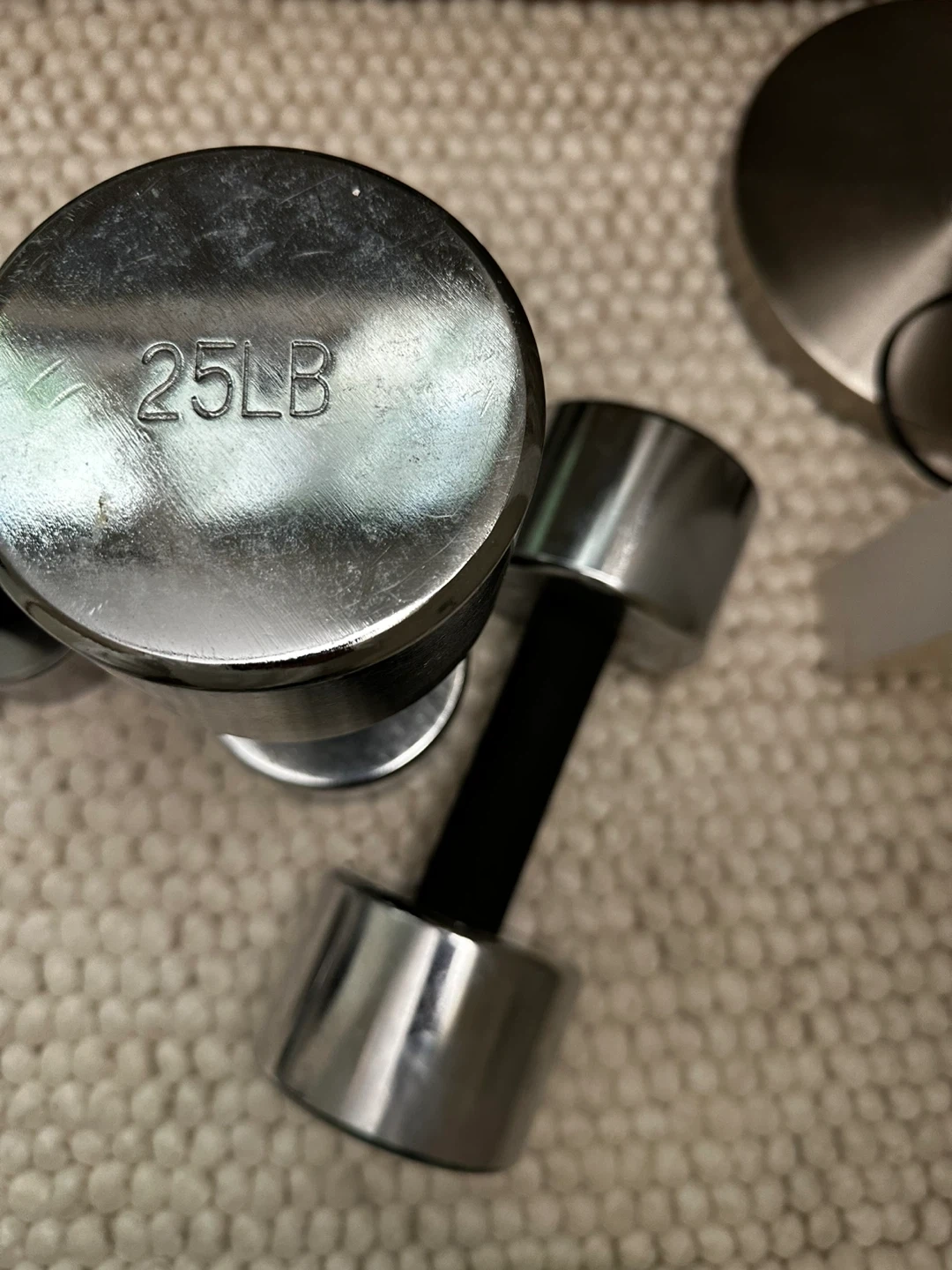15Selling two sets of dumbbells! One set is 12lb and the other is 25lb. Great for home workouts and building strength. Shiny steel with black foam/rubber handles - chic/modern look.
