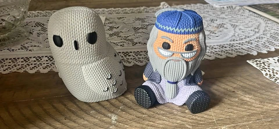 Harry Potter Hedwig #068 Figure and Albus Dumbledore #065 Knit Series from Handmade by Robots. Hedwig and Dumbledore look like knit fabric, but he is actually vinyl. Vinyl Tag to look like a sewn in label. Approx. Size 5"