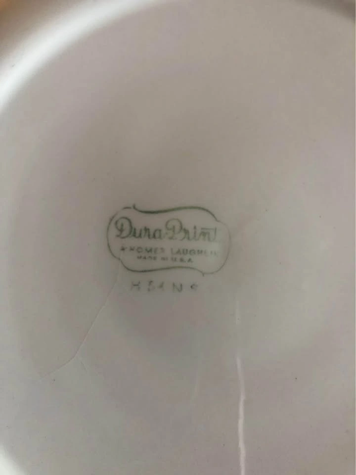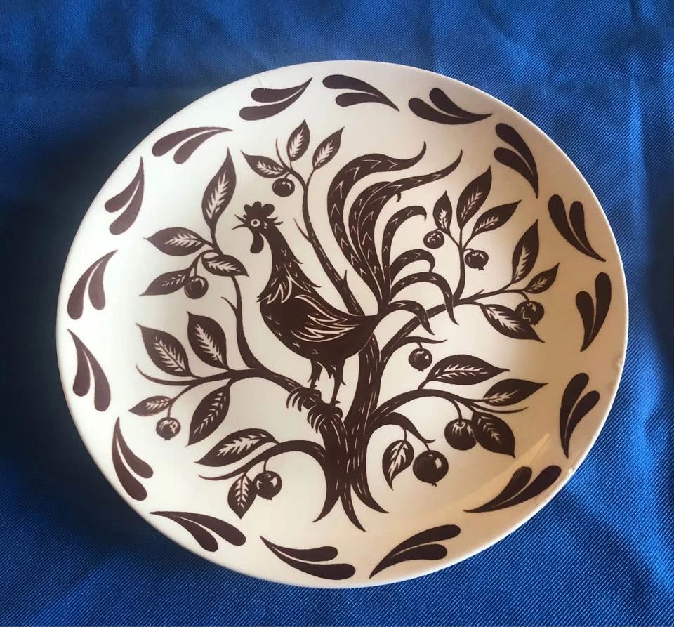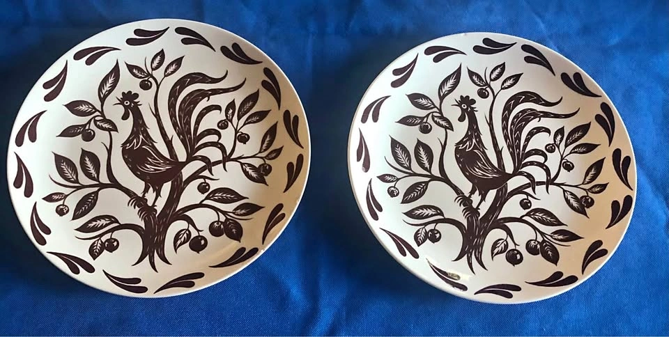 95This product is a set of two vintage Dura-Print Homer Laughlin Chanticleer rooster dinner plates. The round ceramic plates feature a mid-century modern design with a glossy brown finish, showcasing a rooster theme that is perfect for all occasions. Manufactured in the 1950s, these original plates are a collectible piece for any antique or pottery enthusiast looking to add a touch of retro charm to their table setting. The printed backstamp confirms the authenticity of the brand and style. One says A55N6. It looks like the other says H54N4. They are 9 and 1:4 inches wide.