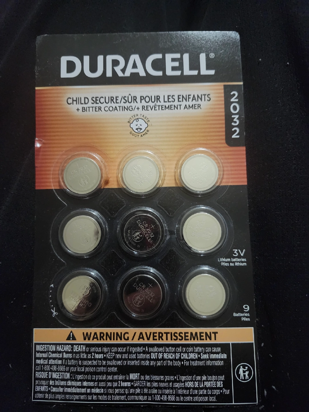 Selling a pack of Duracell 2032 3V lithium batteries. This pack contains 9 batteries and features child-secure packaging with a bitter coating to prevent accidental ingestion. Keep your devices powered safely!