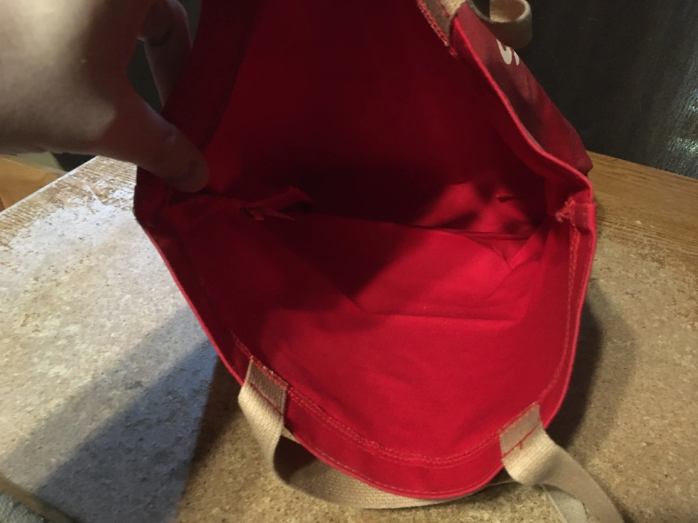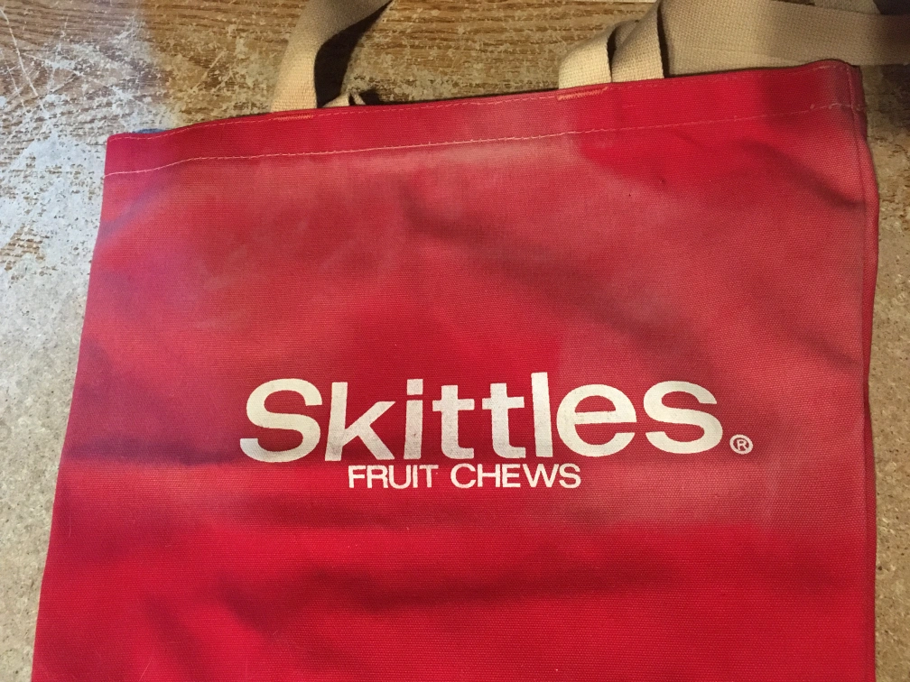 Here's a fun red tote bag featuring the Skittles Fruit Chews logo! It's perfect for carrying groceries, books, or anything else you need. The bag has tan handles and is in good condition. bag has some fading on the top part of the front. pick up at house.