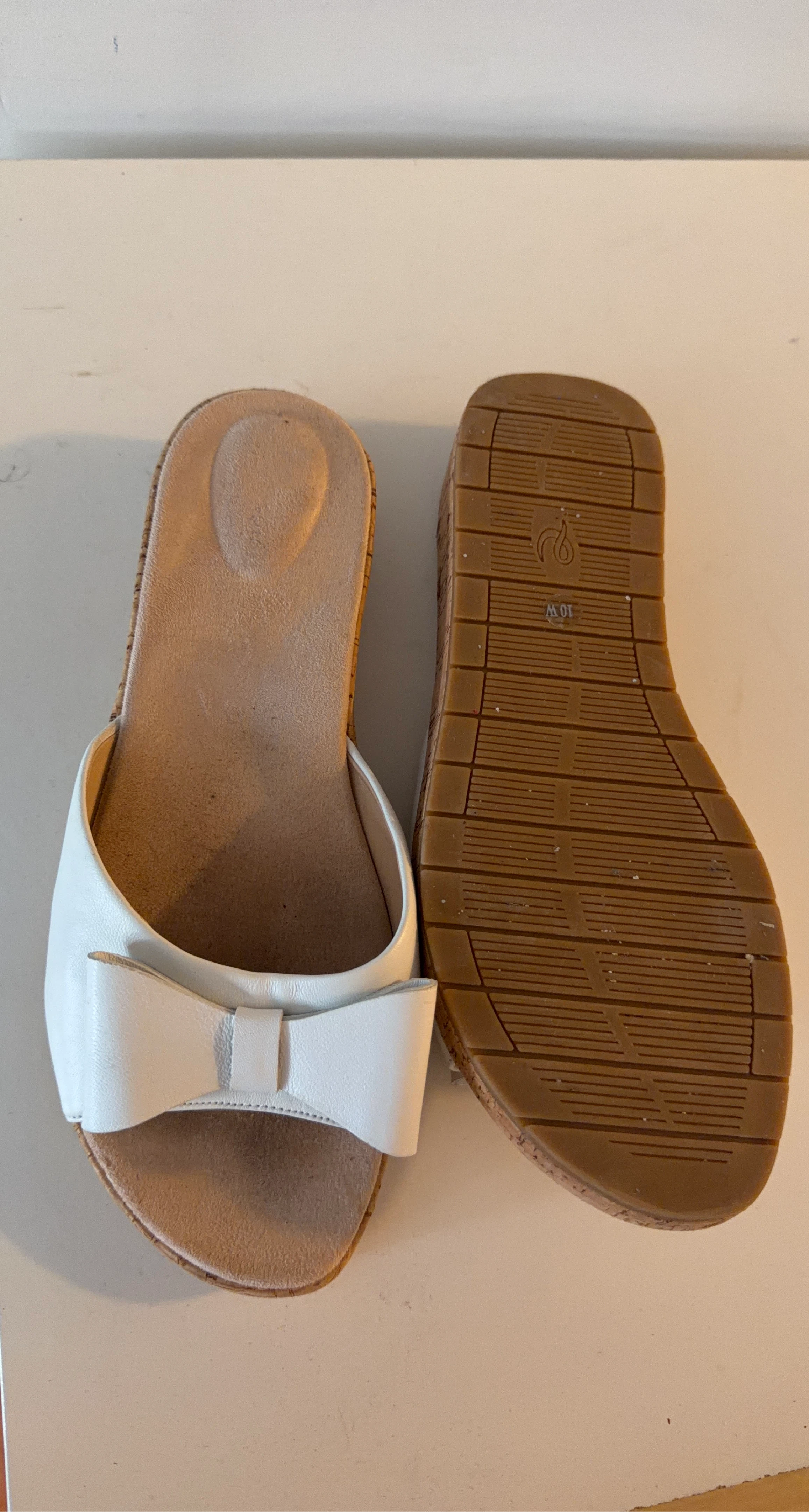 Selling a pair of DV by Dolce Vita white sandals in size 10W. These sandals feature a cute bow detail and a comfortable cork-like sole. They are perfect for a casual outing or a summer day!