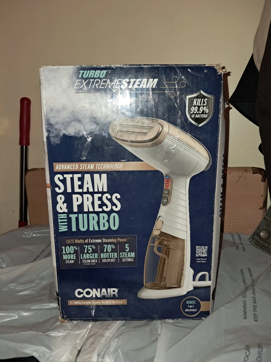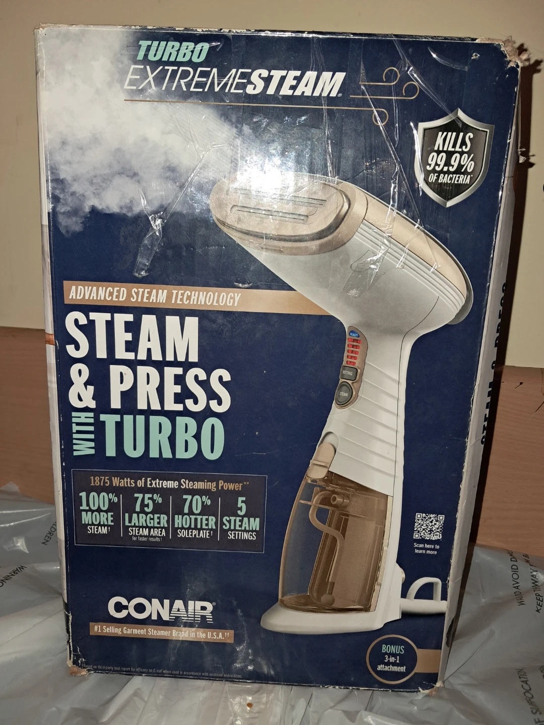 Conair Turbo ExtremeSteam handheld garment steamer. 1875 Watts of Extreme Steaming Power. Kills 99.9% of bacteria. Includes bonus 3-in-1 attachment.