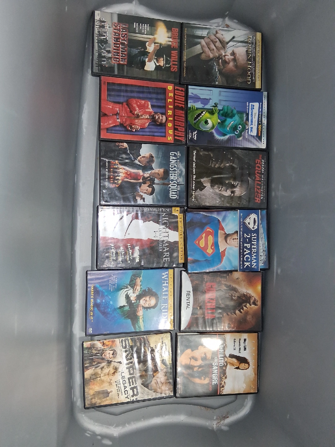 10Selling a collection of DVDs. Titles include Last Man Standing, Hostage, Delirious, Gangster Squad, The Equalizer, NightMare, Superman 2-Pack, What Lies Beneath, Sharknado, Sniper Legacy, Phillip and Salvatore, Antz, A Bug's Life, Oxford Murders, Fury, Runner, Loveless, IP Man, Penguins, The A-Team, Red Tails, Seal Team 8, Snuff Bottle Collection, There Be Dragons, Lone Survivor, Chicken Run, and Tom and Jerry Spotlight Collection