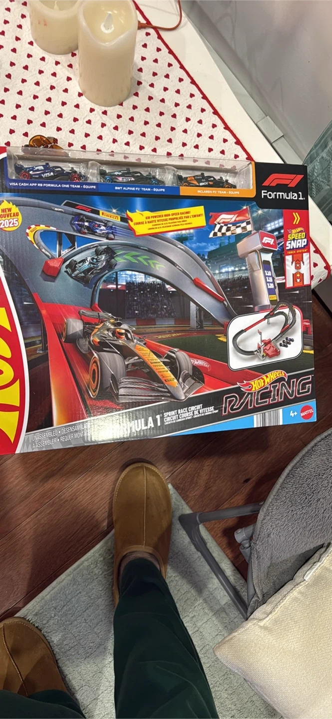 This is a Hot Wheels Formula 1 Sprint Race Circuit playset. It's kid-powered for high-speed racing fun. The set includes multiple F1 cars from different teams.