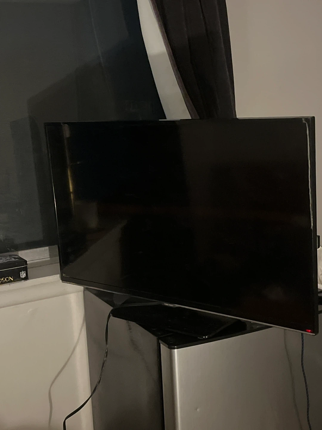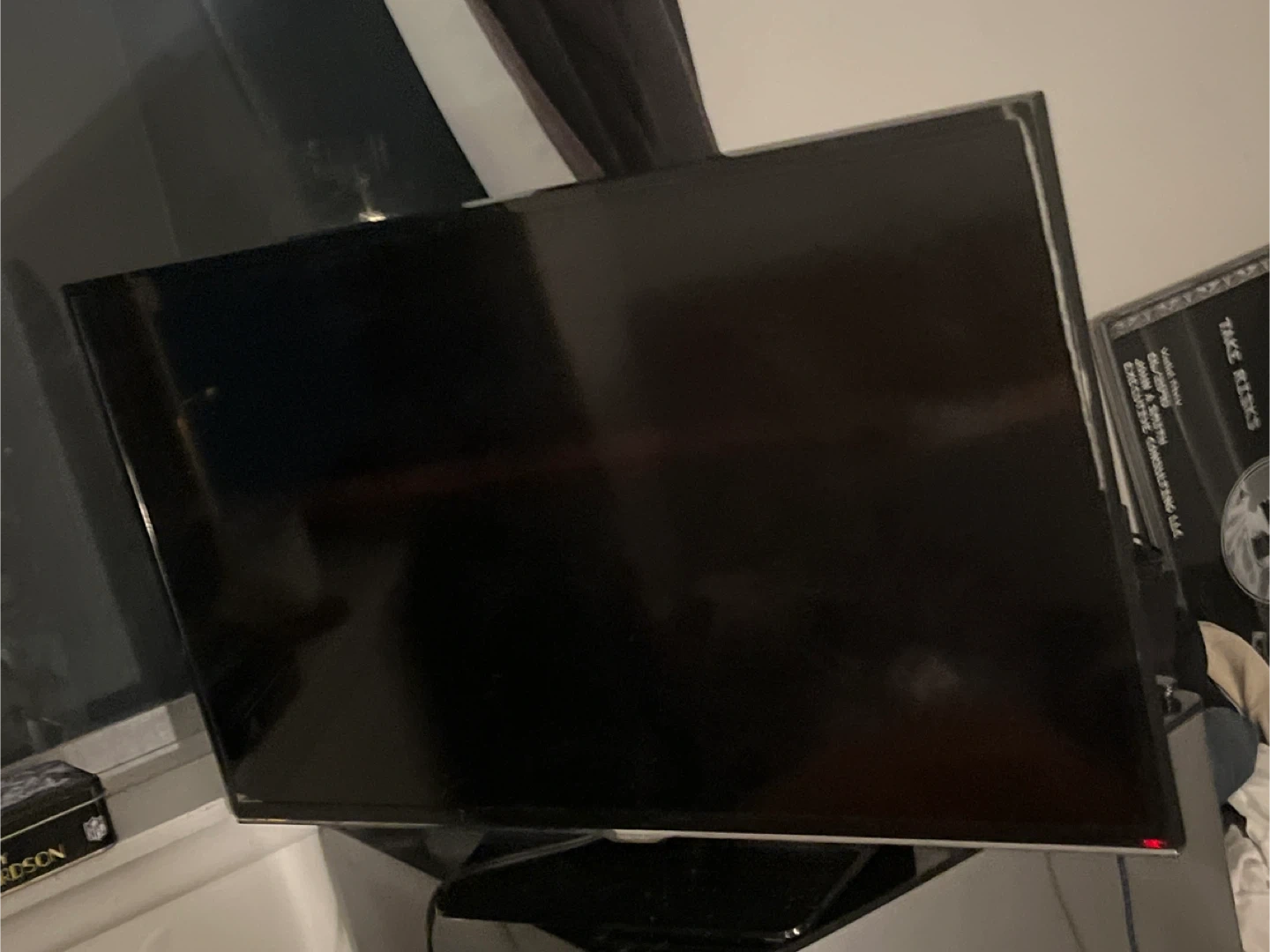 This is a gently used Samsung smart television. It has a black screen and a black frame. The television is completely functional.
