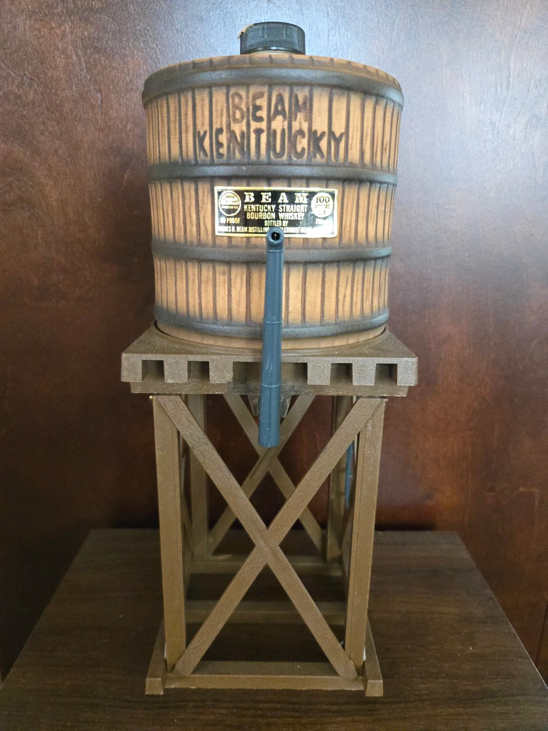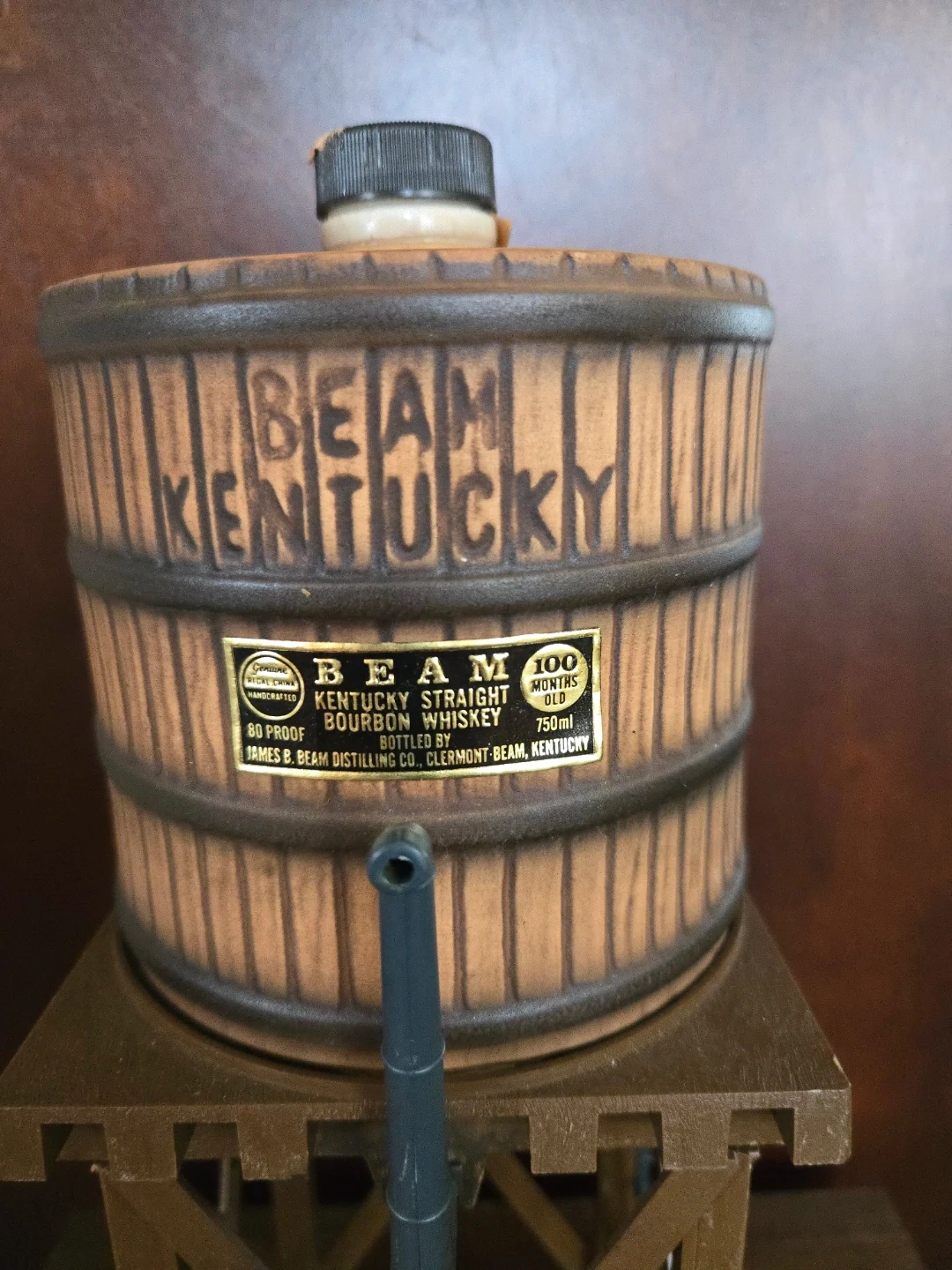 Vintage Jim Beam water tower decanter. It's a 100 months old Kentucky Straight Bourbon Whiskey collectible. This ceramic decanter holds 750ml.