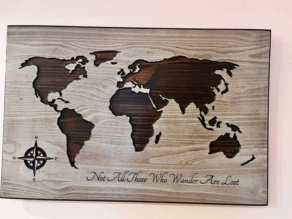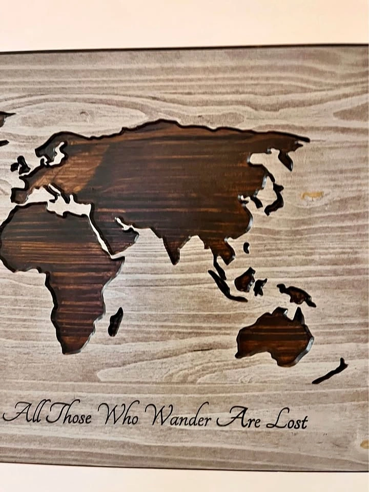 Wooden World Map Wall Art 'Not All Those Who Wander Are Lost'