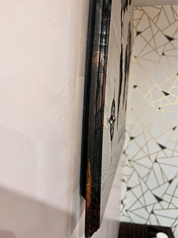 Unique wooden world map wall decor. Has dark brown continents on light wood background. Measurement approximately 33x22". Located in the Upper West Side.
