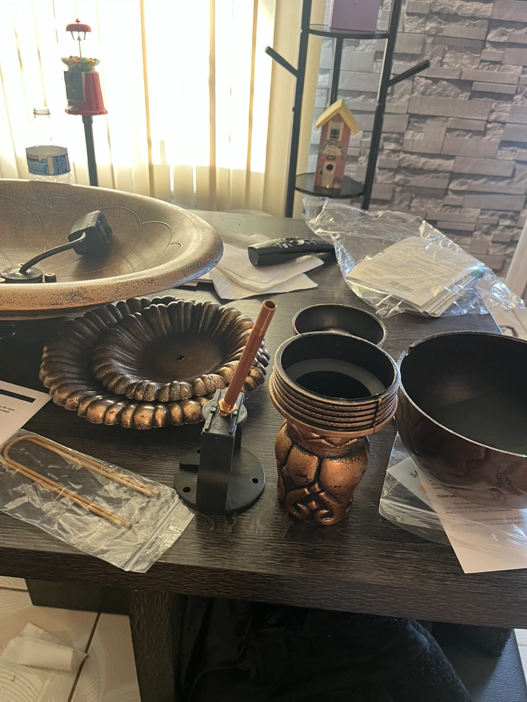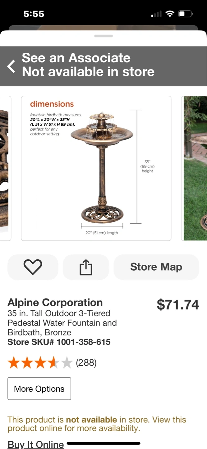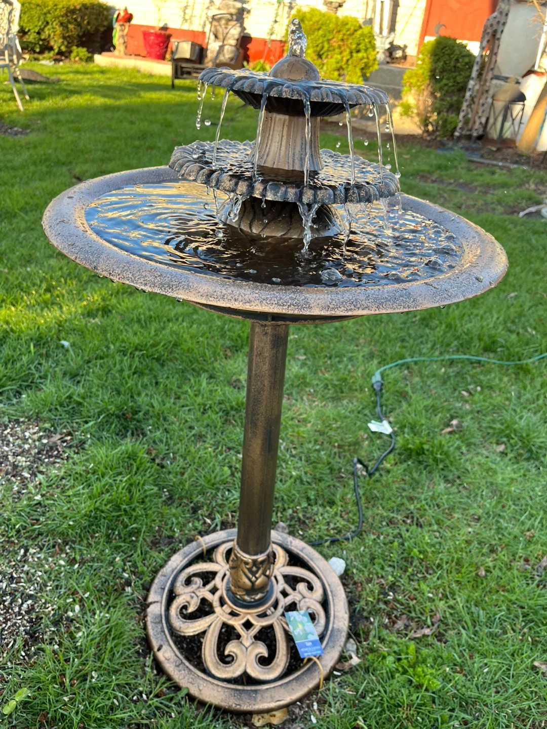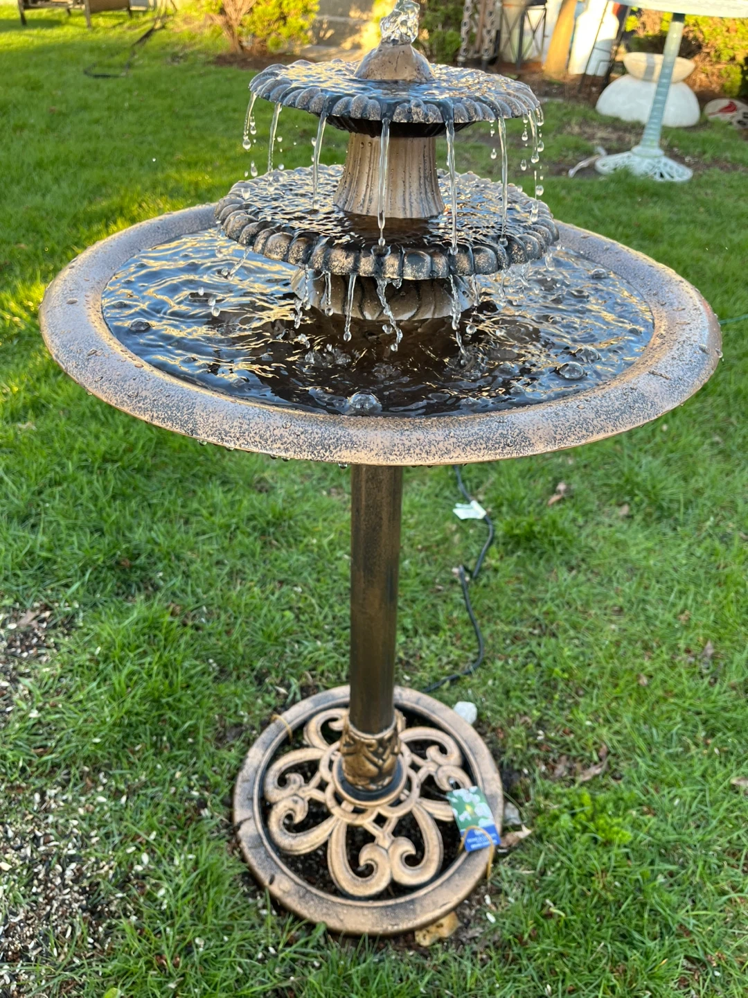 This Alpine Corporation 35-inch tall outdoor fountain and birdbath features a bronze finish. It's a 3-tiered design with cascading water. It would be a lovely addition to any garden or patio space! Plastic, new in box