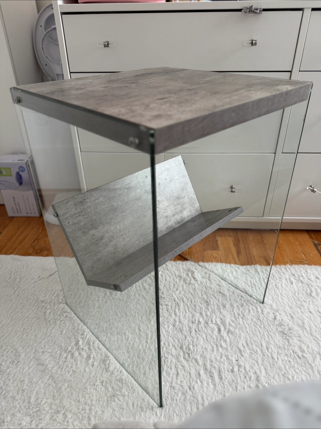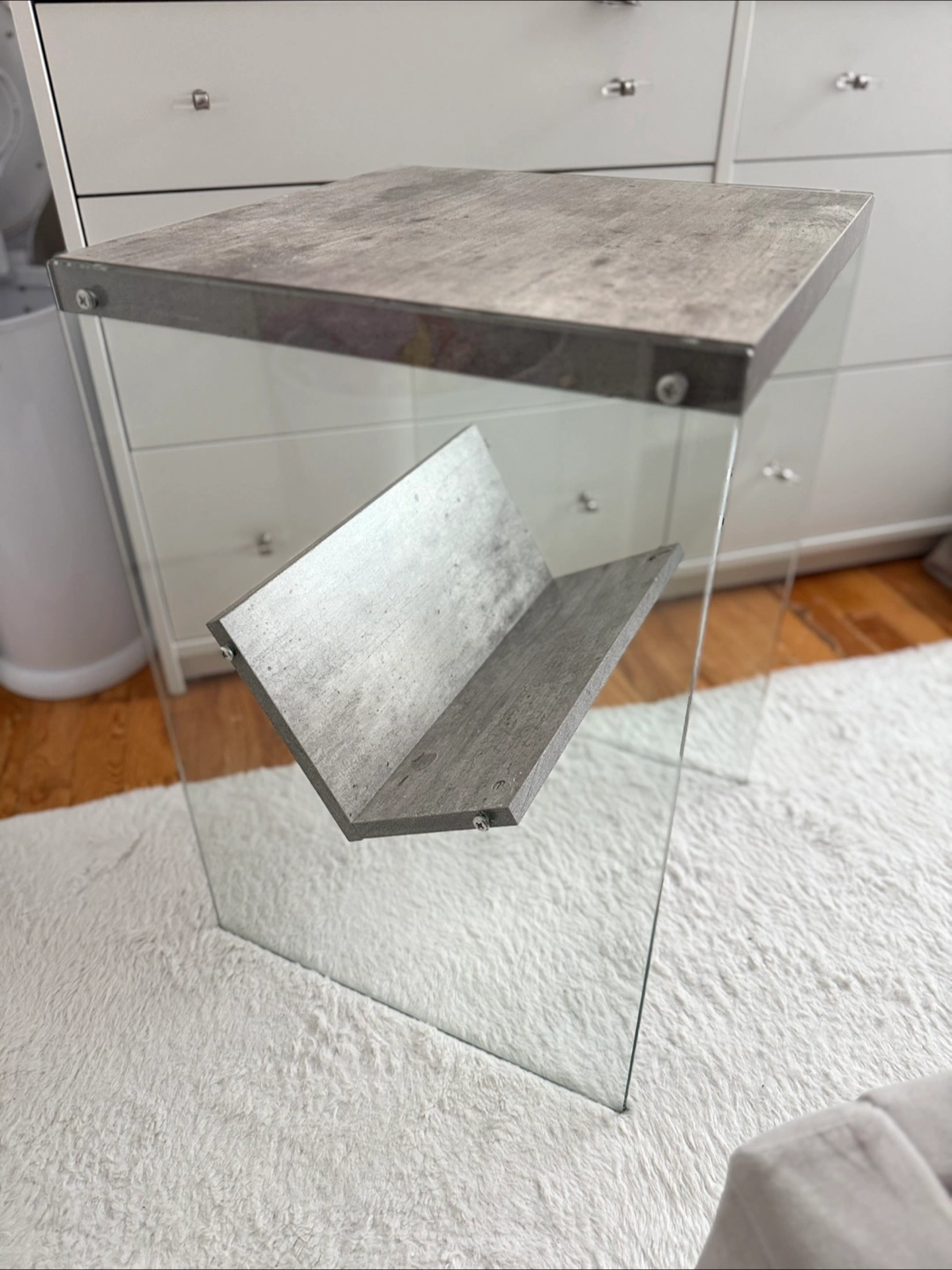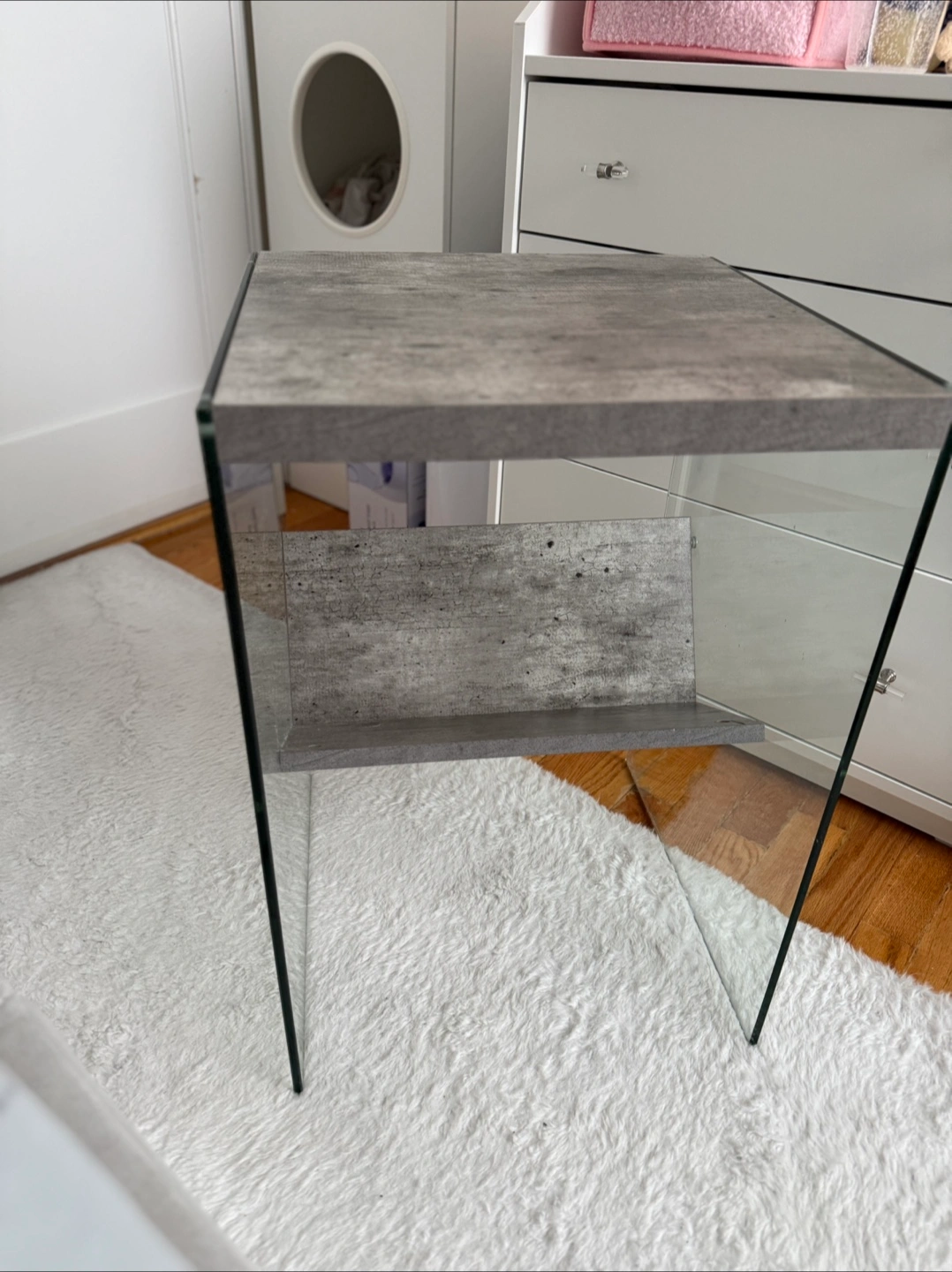Selling two(2) modern accent tables with a glass frame and faux stone top and shelf. It's a stylish piece that adds a touch of elegance to any room. Perfect as a sturdy night stand. Great for displaying decor or holding books!