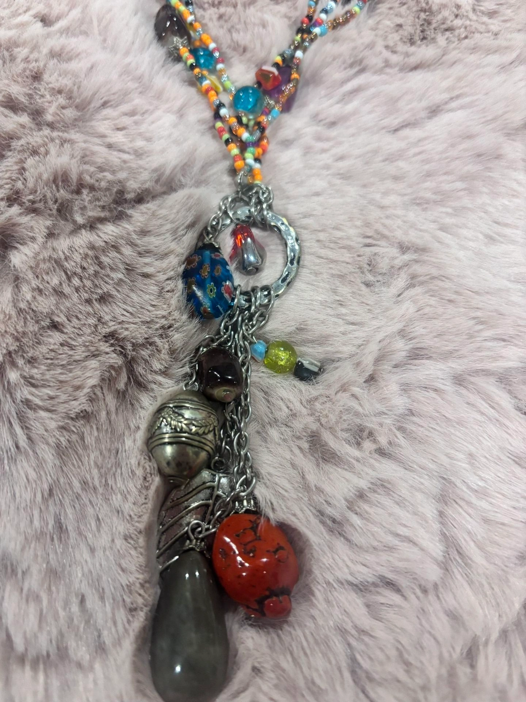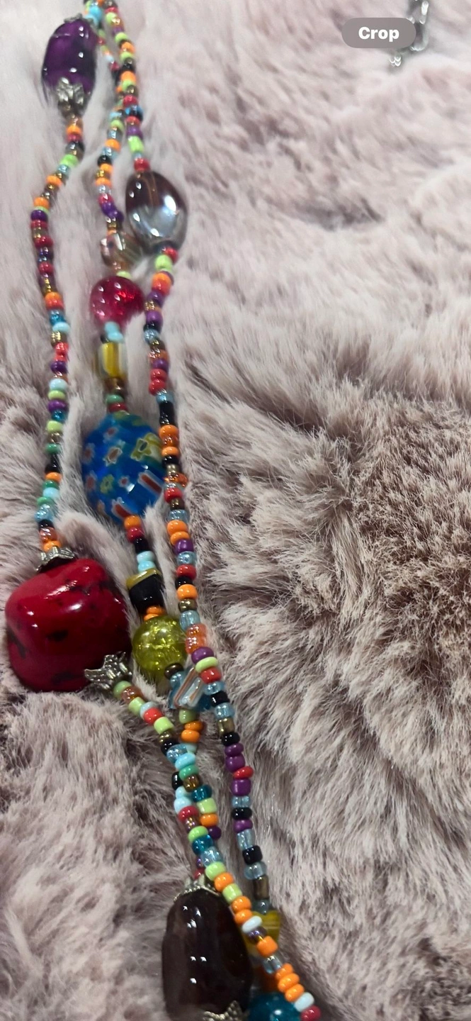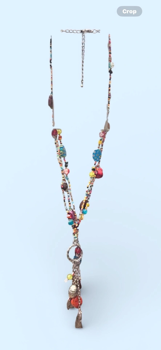 One-of-a-kind, handcrafted bohemian statement necklace with multiple strands of colorful seed beads, mixed glass beads, and an eye-catching charm cluster drop. This long, layered design creates beautiful movement and texture, perfect for festivals, travel, or casual outfits. The pendant features a mix of glass and metal charms with an eclectic, artisan feel. Finished with an adjustable chain closure for versatile styling.