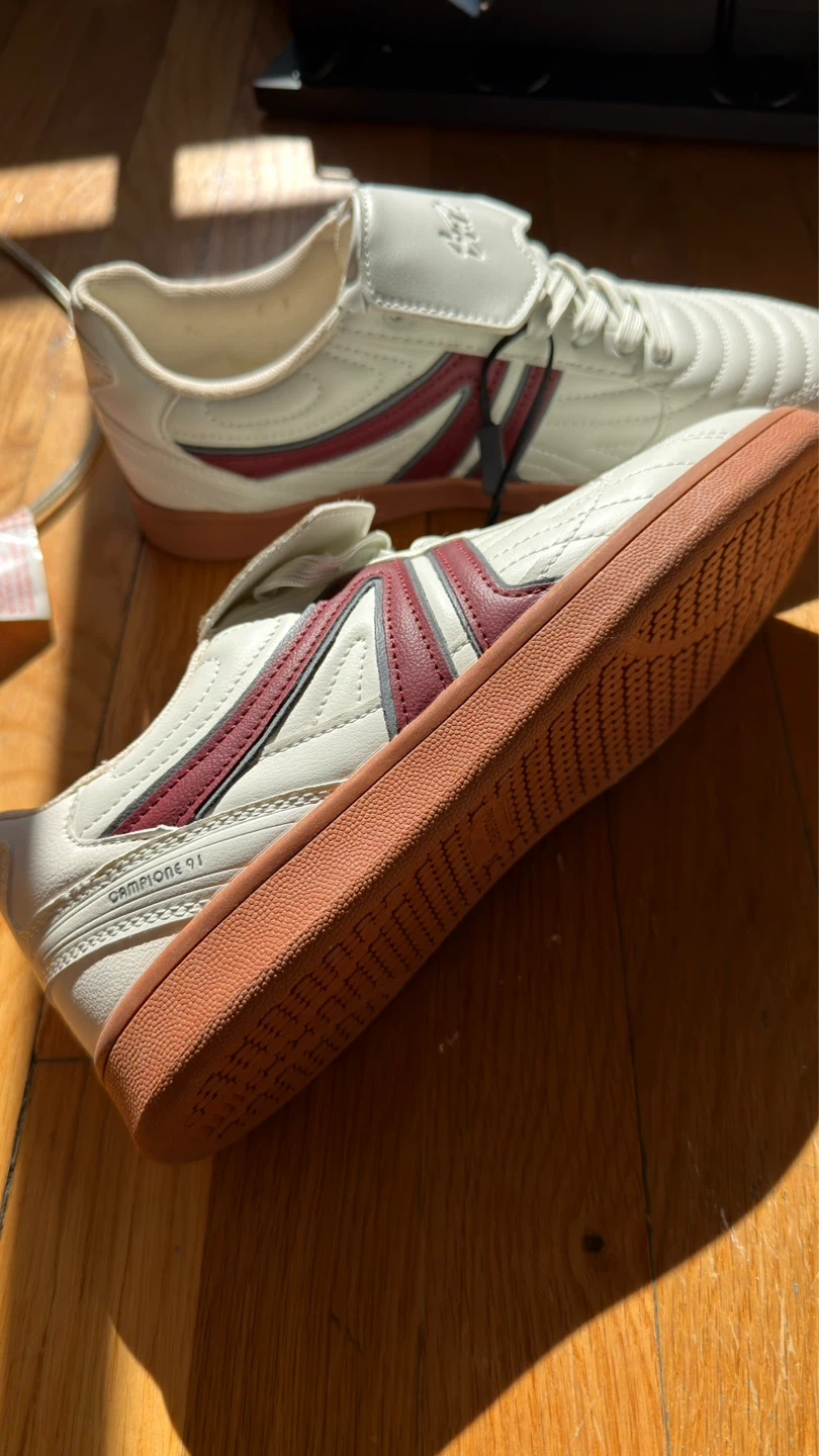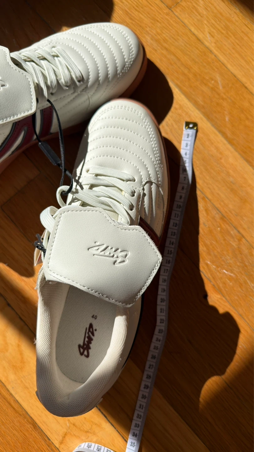 White Stylo soccer cleats with maroon stripe accents and a brown sole. Lace-up closure with an additional velcro strap for a secure fit. Perfect for indoor soccer or turf play! (Size 40 = 11inch =0.279 meters 29cm