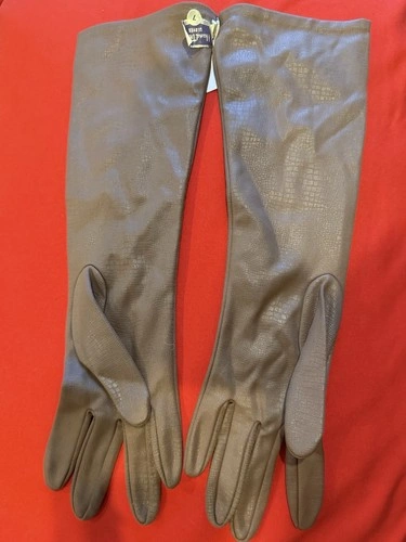 A pair of light brown faux leather opera gloves with a subtle crocodile texture by Crocodette. These women's gloves have a faux leather trim and offer light warmth, suitable for winter, fall, and spring. They are a stylish and comfortable addition to any wardrobe. Made with high-quality materials. Dry clean only.