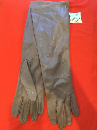 A pair of light brown faux leather opera gloves with a subtle crocodile texture by Crocodette. These women's gloves have a faux leather trim and offer light warmth, suitable for winter, fall, and spring. They are a stylish and comfortable addition to any wardrobe. Made with high-quality materials. Dry clean only.