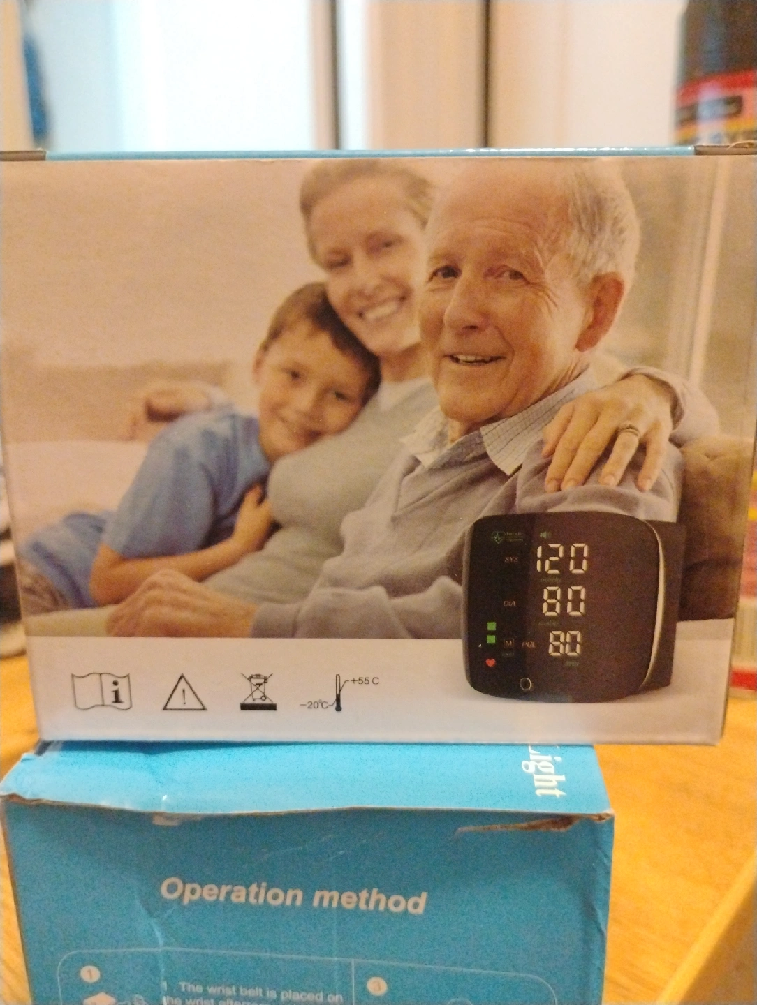 This is a wrist electronic sphygmomanometer, still in its original box. It measures blood pressure. It shows the systolic and diastolic pressure and pulse rate.