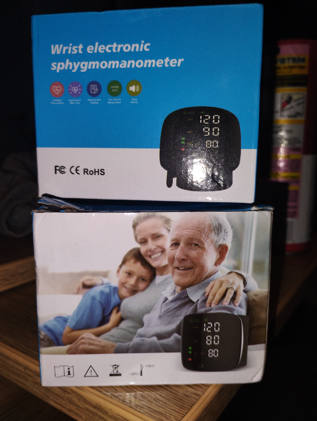 This is a wrist electronic sphygmomanometer, still in its original box. It measures blood pressure. It shows the systolic and diastolic pressure and pulse rate.
