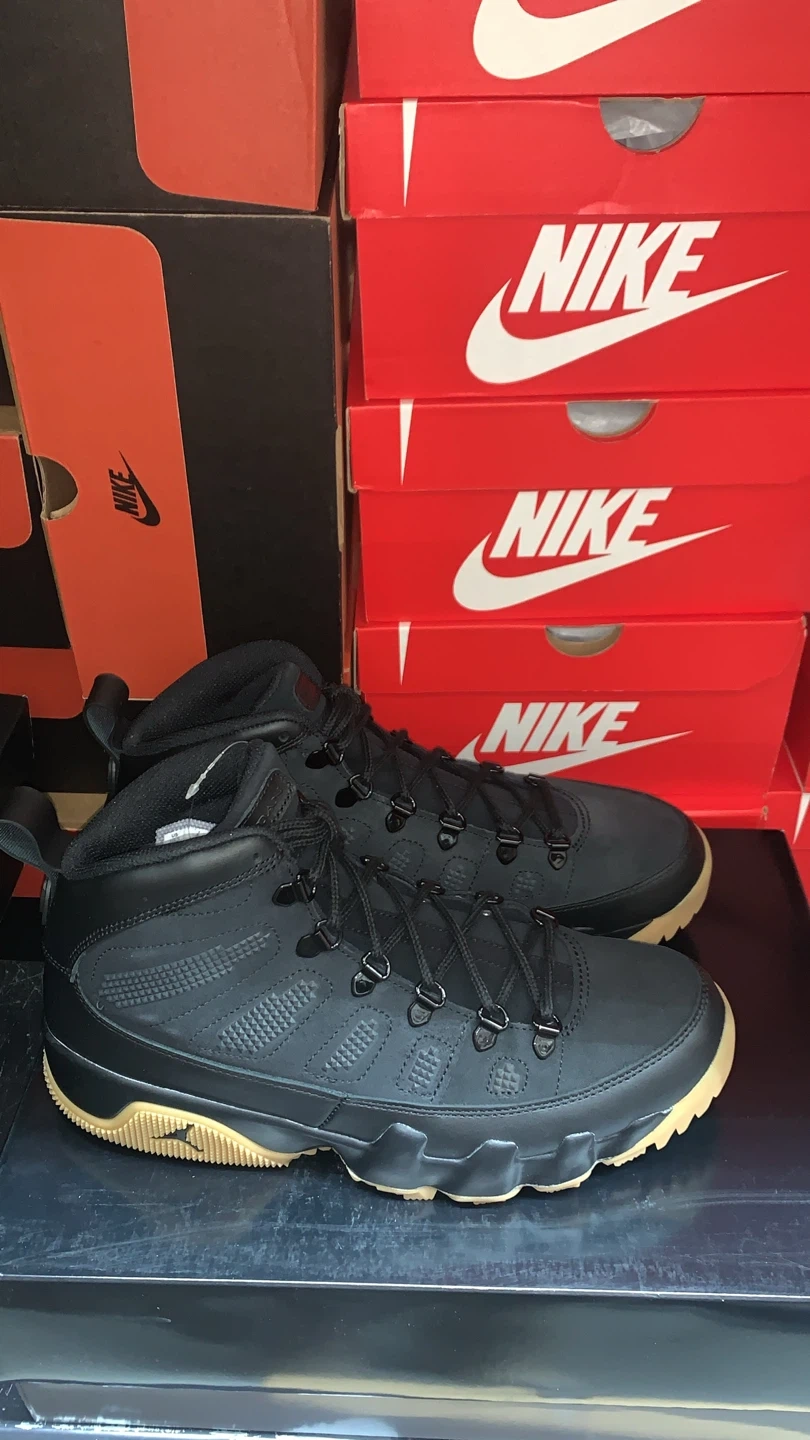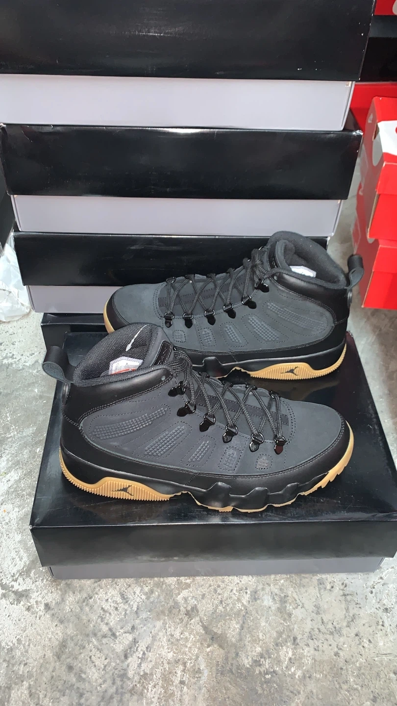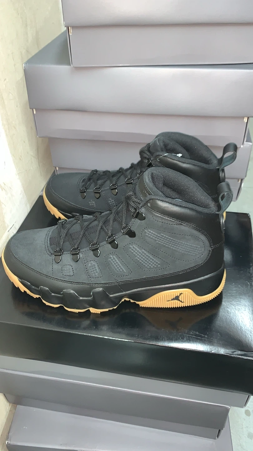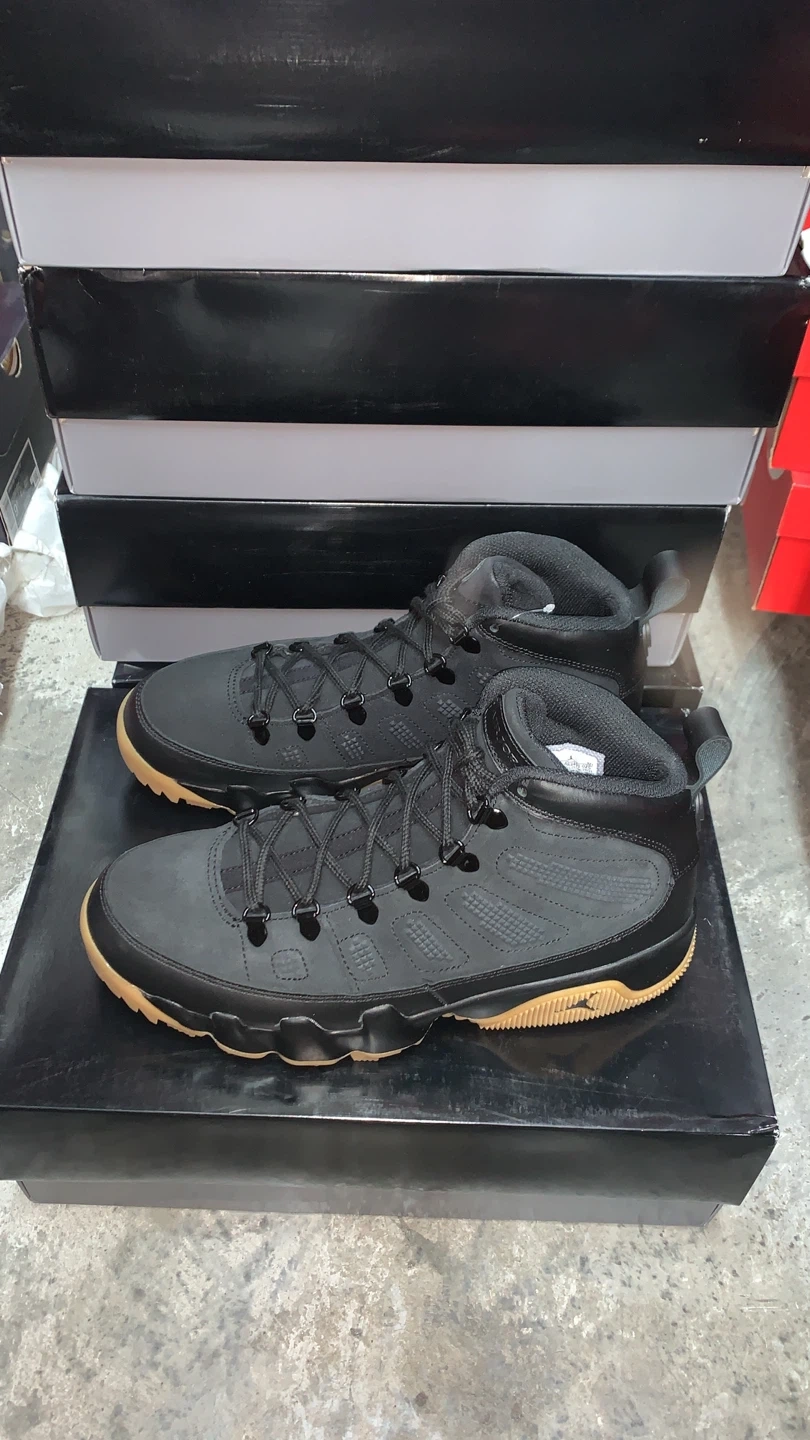Black Air Jordan 9 Retro sneakers. Men's size 10.5. Includes original box and packaging. Gum sole detail.