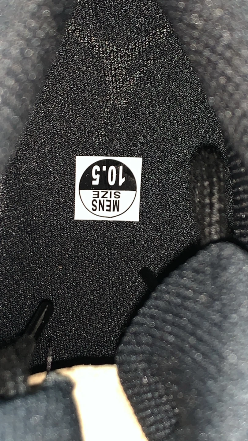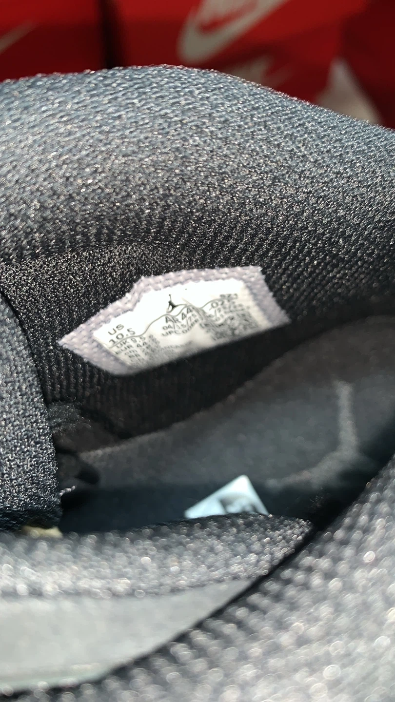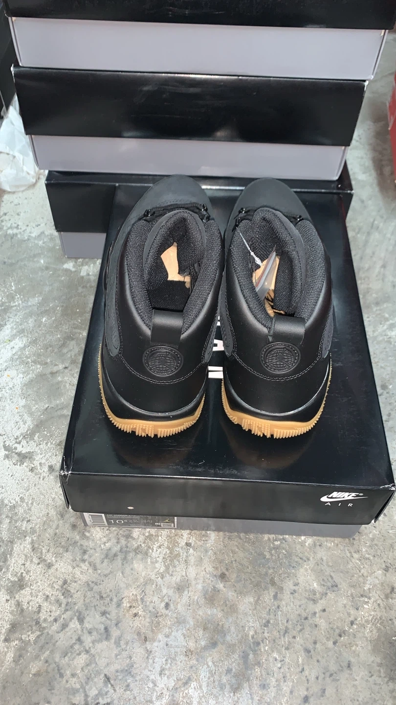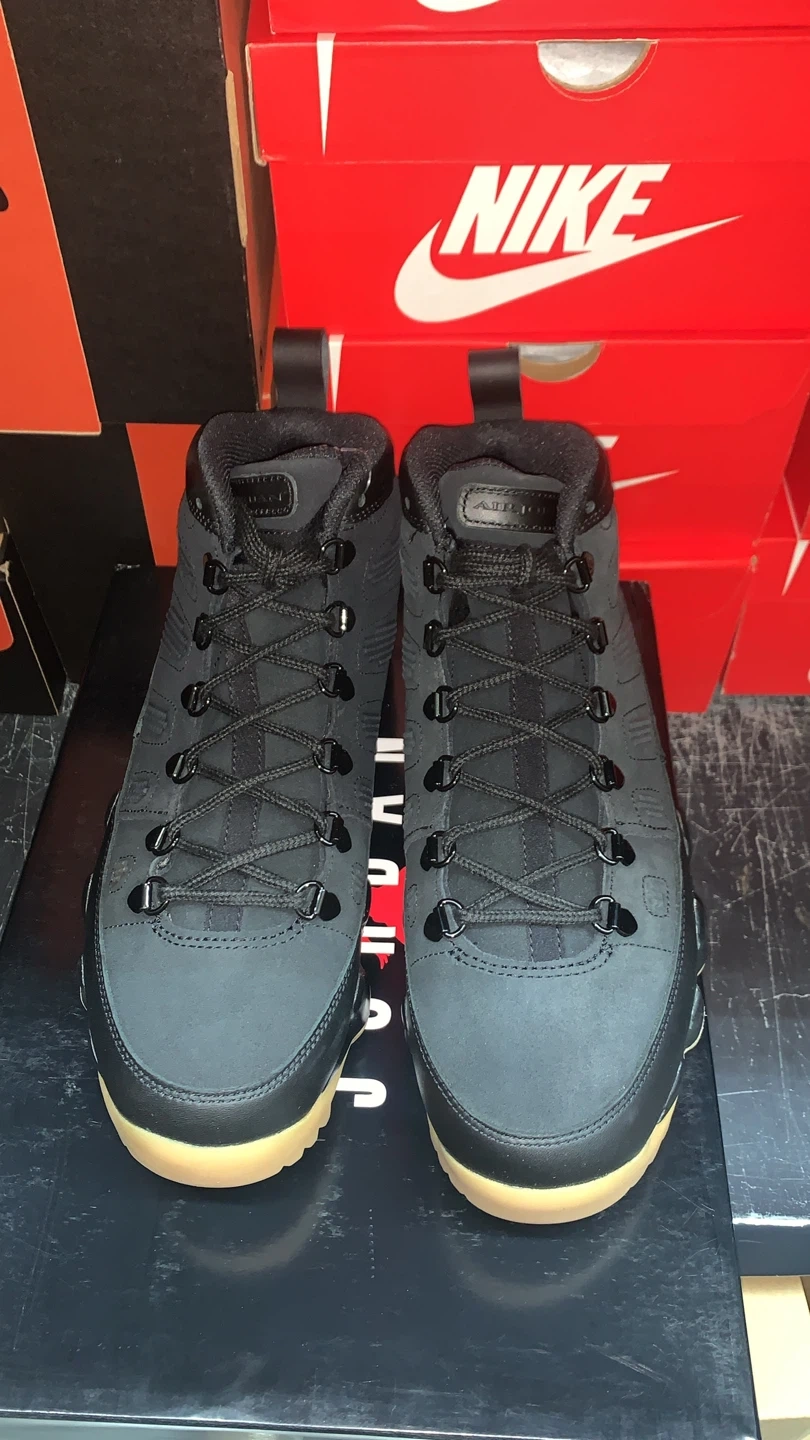 Black Air Jordan 9 Retro sneakers. Men's size 10.5. Includes original box and packaging. Gum sole detail.