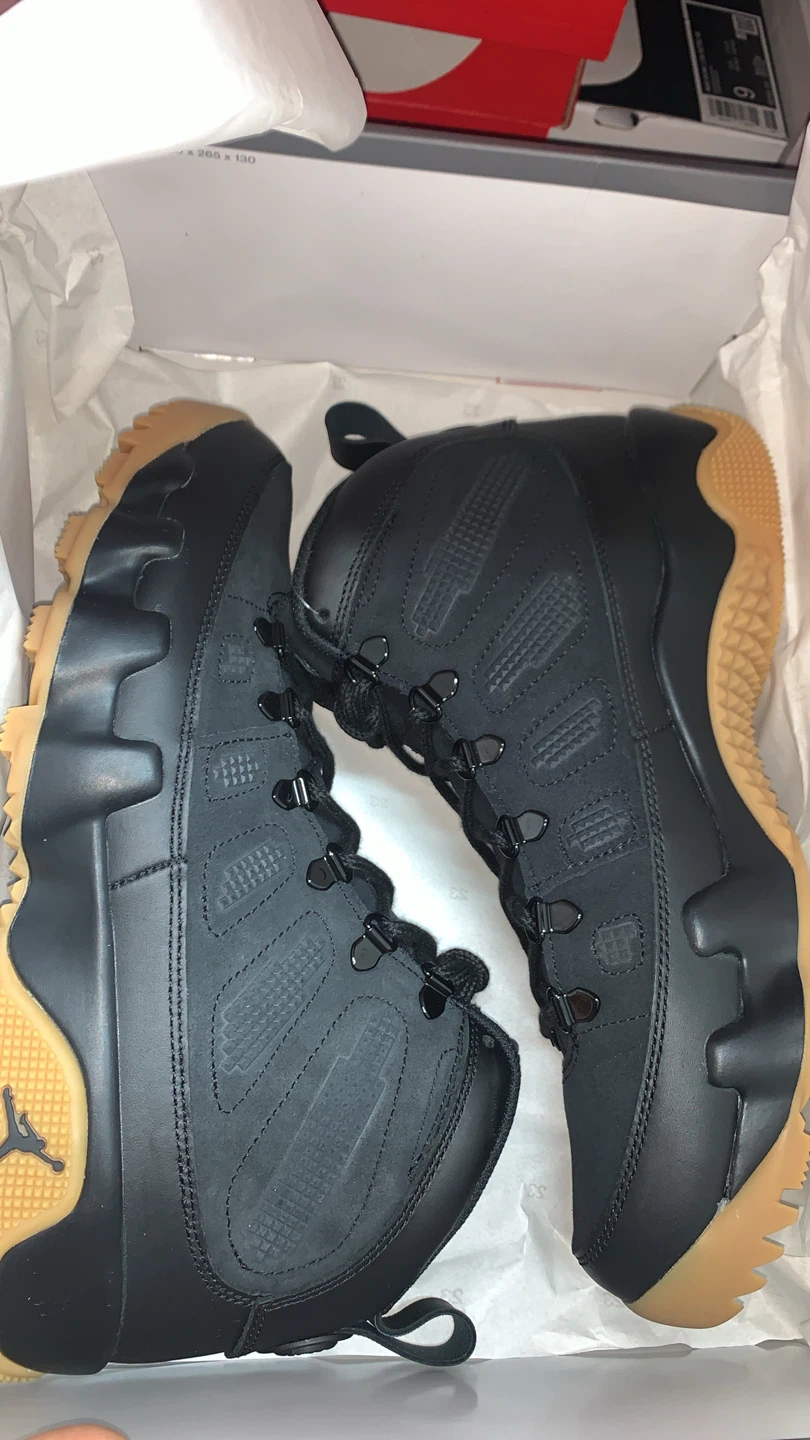 Black Air Jordan 9 Retro sneakers. Men's size 10.5. Includes original box and packaging. Gum sole detail.
