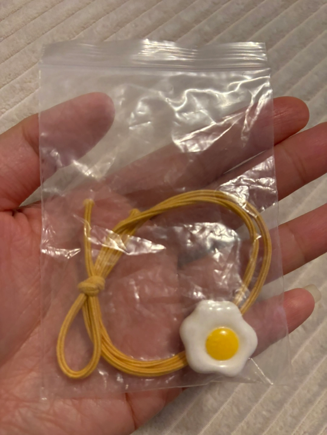 Adorable hair tie featuring a fried egg charm. Perfect for adding a fun touch to your hairstyle. Features a pale yellow elastic band.