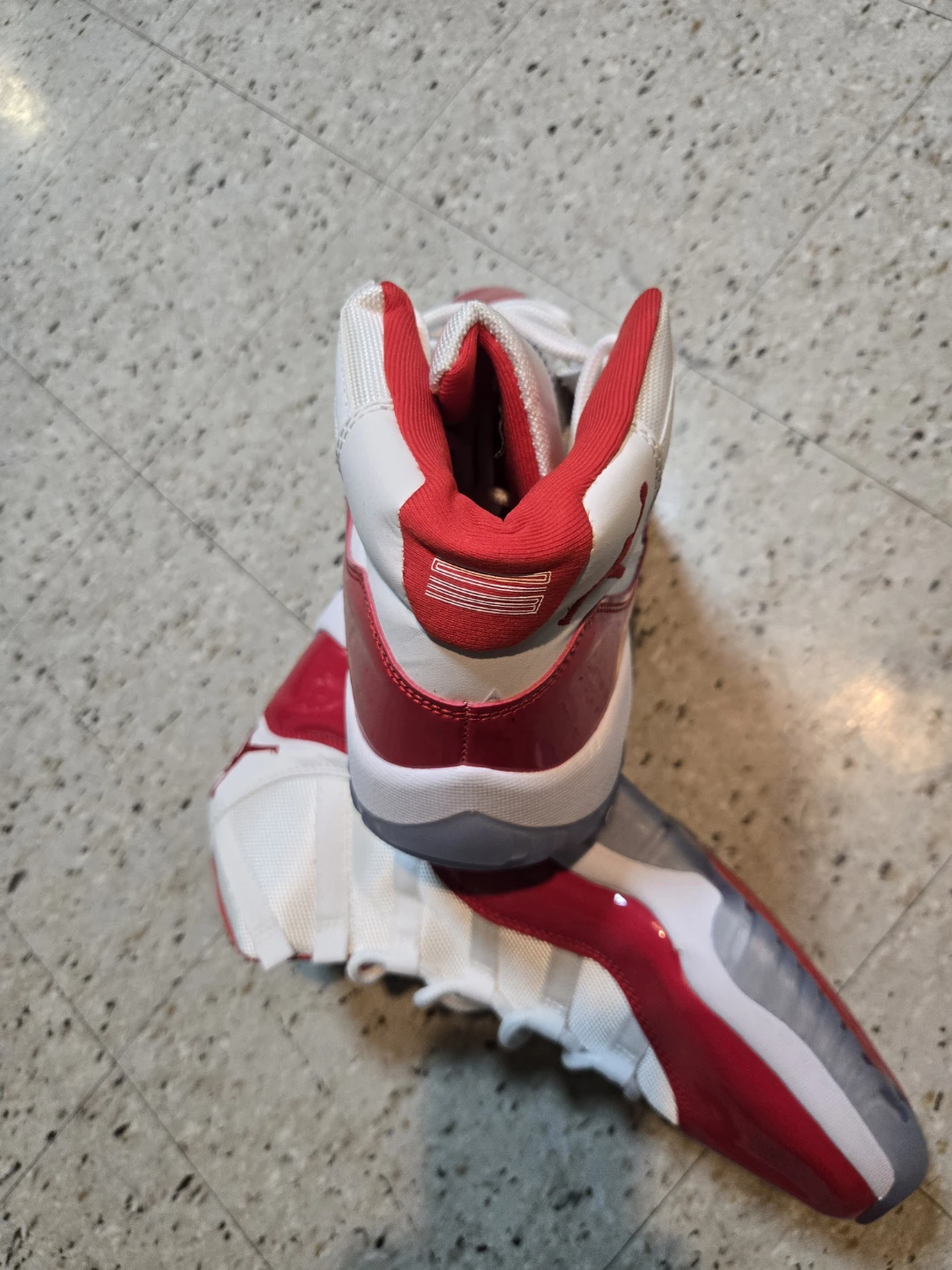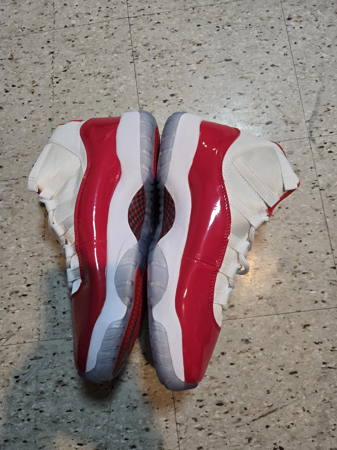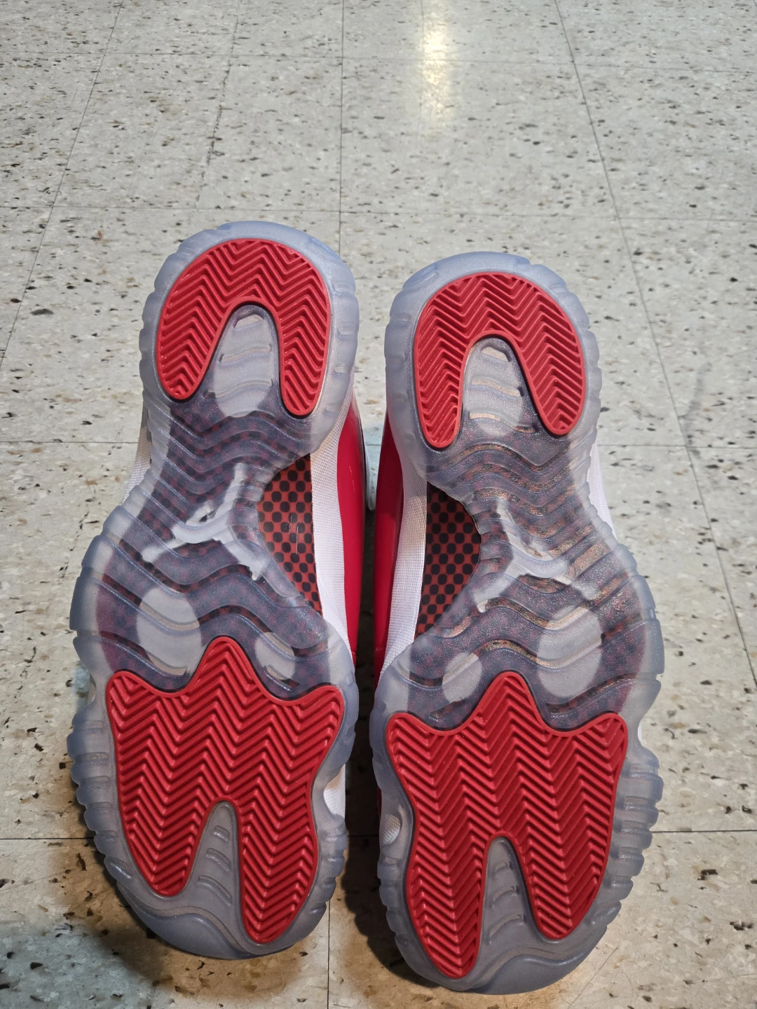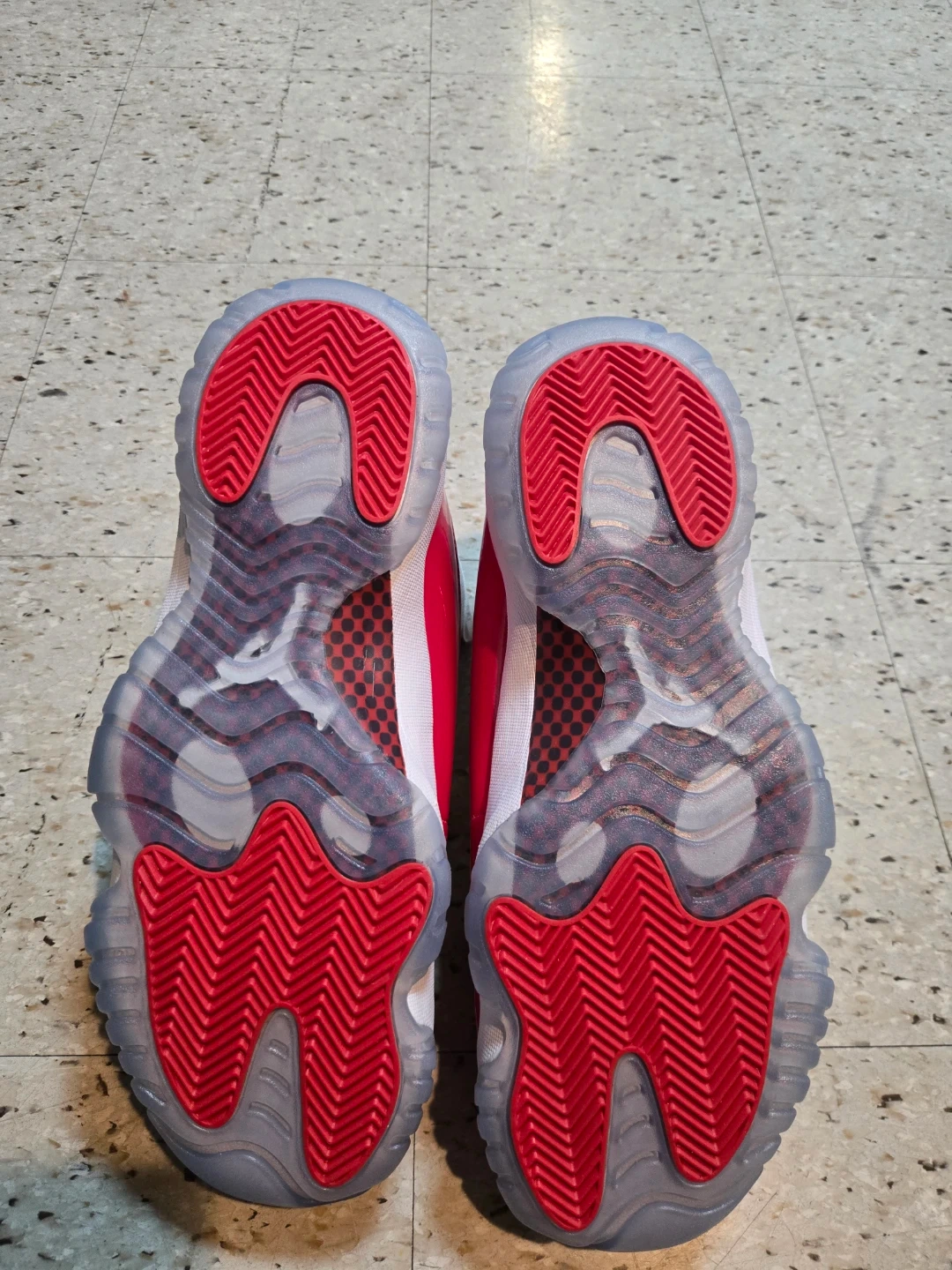 These Air Jordan 11 Retro Low shoes feature a white mesh and leather upper with vibrant red patent leather accents. Translucent icy blue outsoles with red traction pods provide excellent grip. Iconic Jordan branding appears on the tongue and heel.
