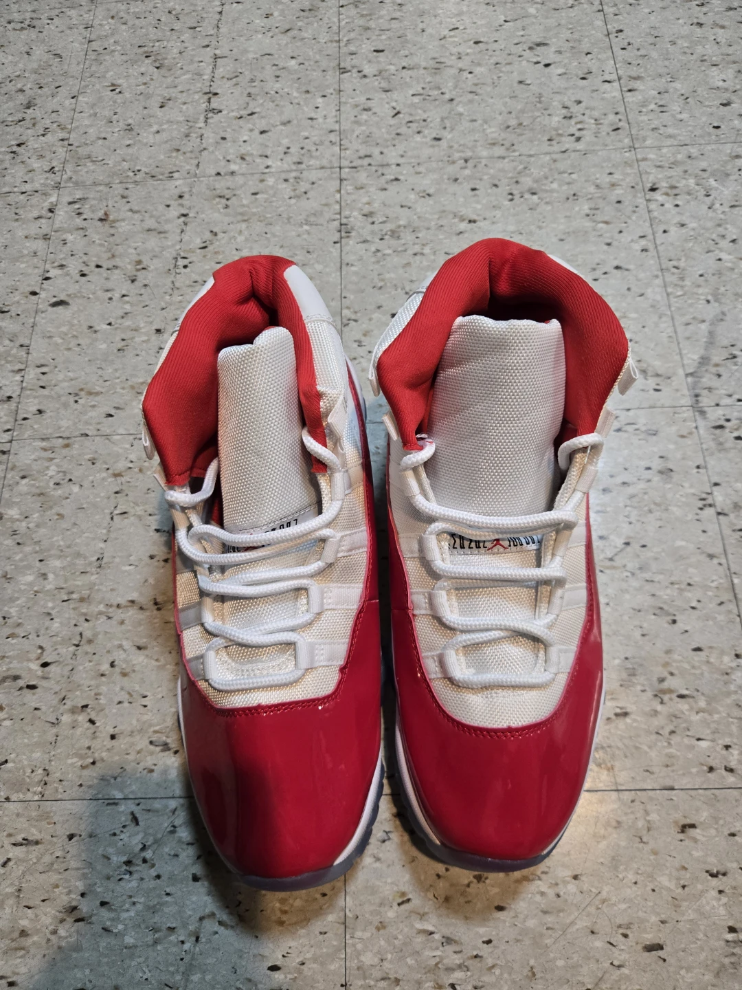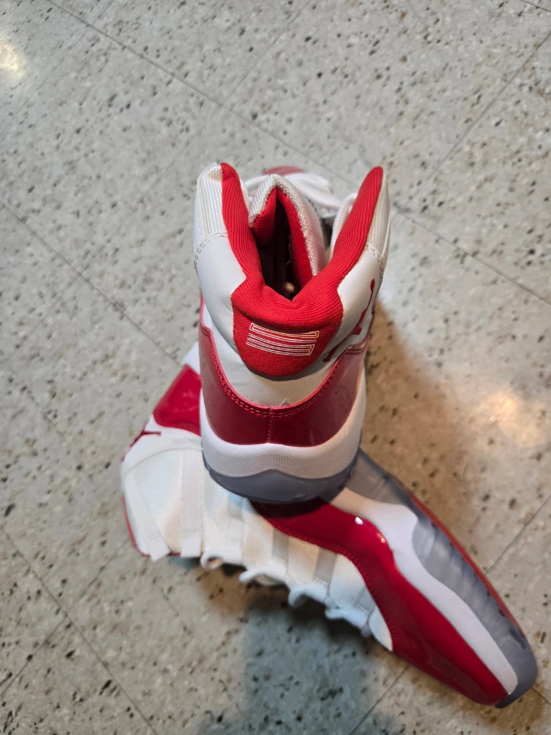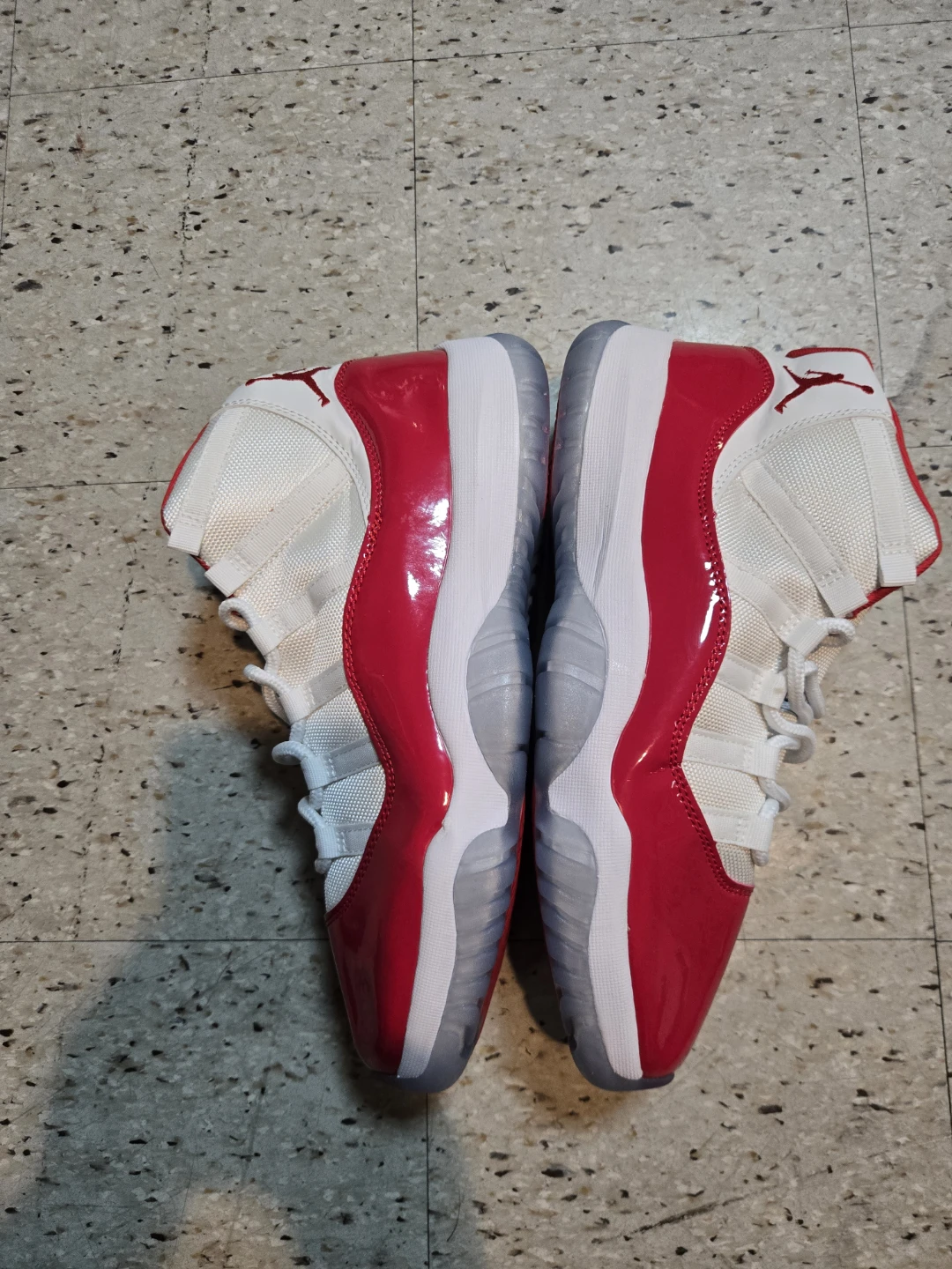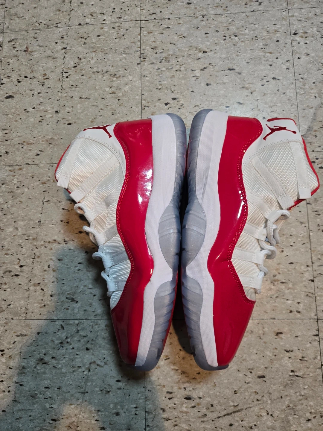 These Air Jordan 11 Retro Low shoes feature a white mesh and leather upper with vibrant red patent leather accents. Translucent icy blue outsoles with red traction pods provide excellent grip. Iconic Jordan branding appears on the tongue and heel.