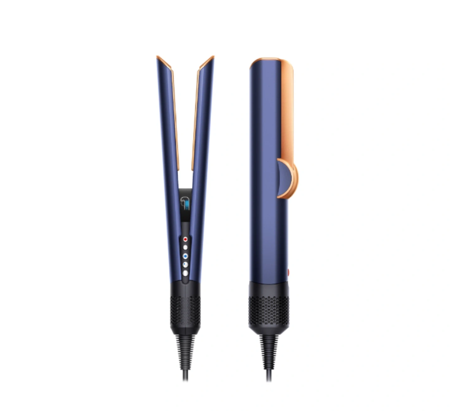 Selling a Dyson Airstrait straightener in blue and copper. This innovative hair tool straightens hair from wet to dry, using air instead of hot plates, which reduces heat damage. It's designed to maintain hair strength and protect its natural shine. It's in great condition and ready for a new home!