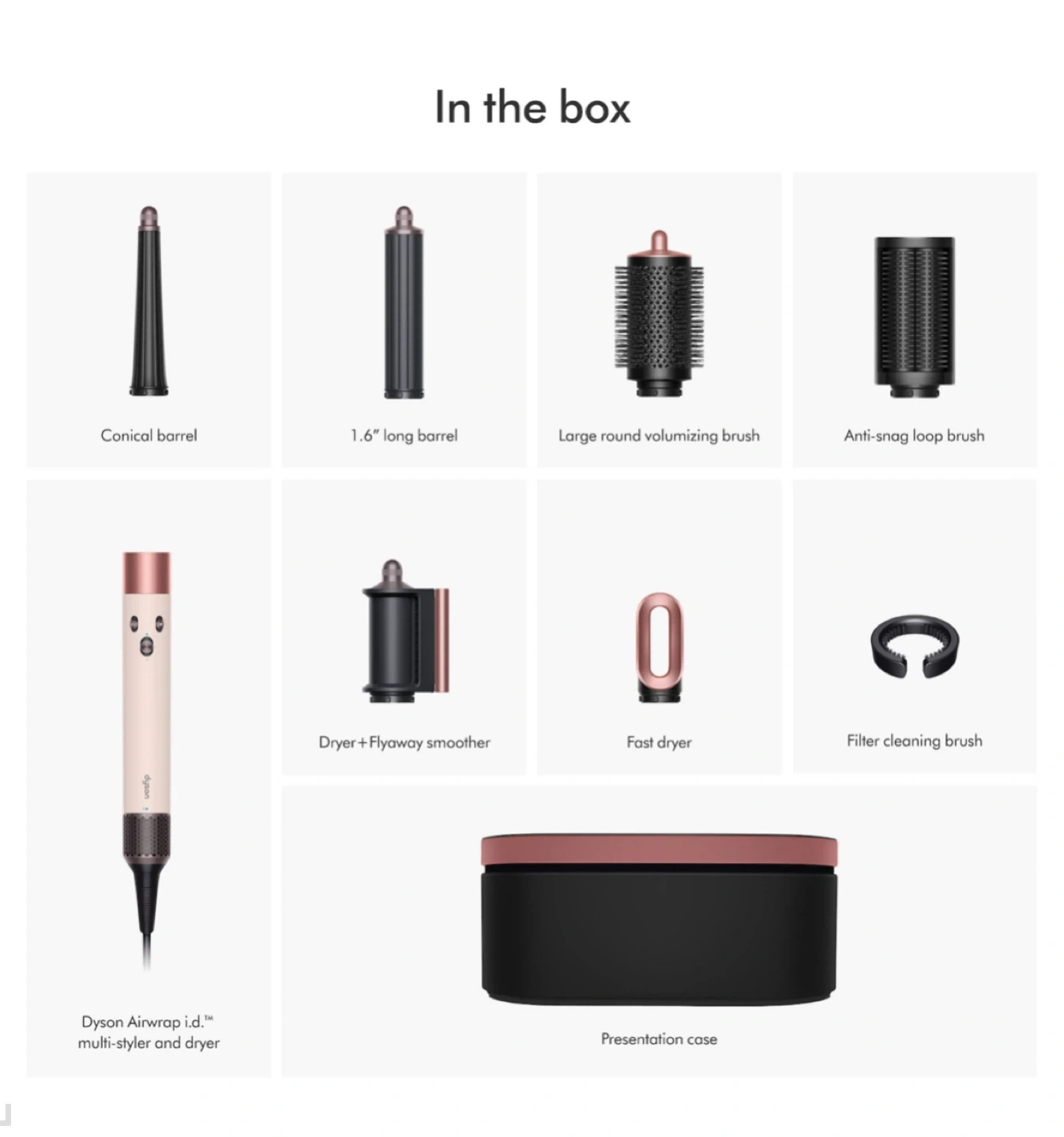 65Selling a Dyson Airwrap i.d. multi-styler and dryer! It comes with a variety of attachments, including a conical barrel, 1.6" long barrel, large round volumizing brush, anti-snag loop brush, dryer + flyaway smoother, fast dryer, and filter cleaning brush. Also includes the presentation case