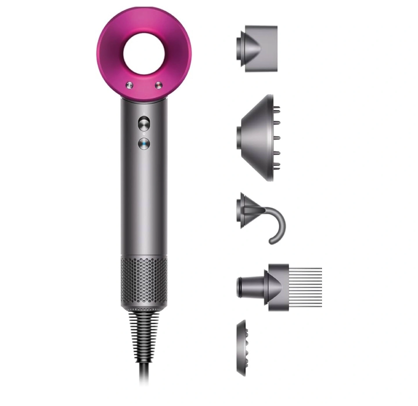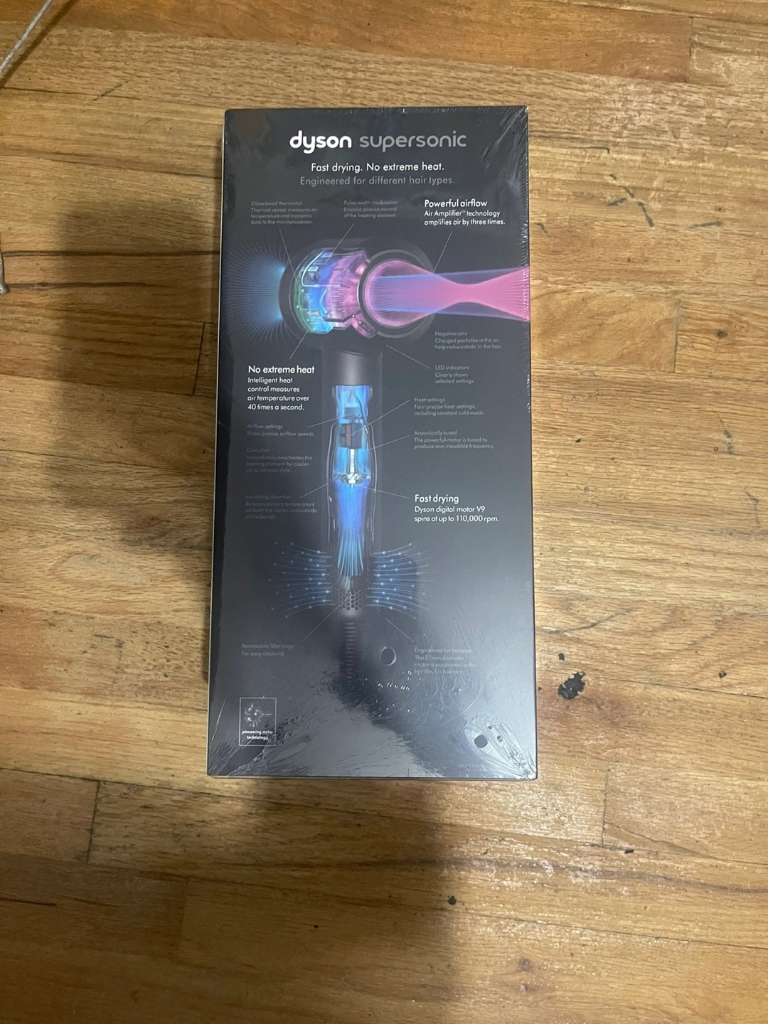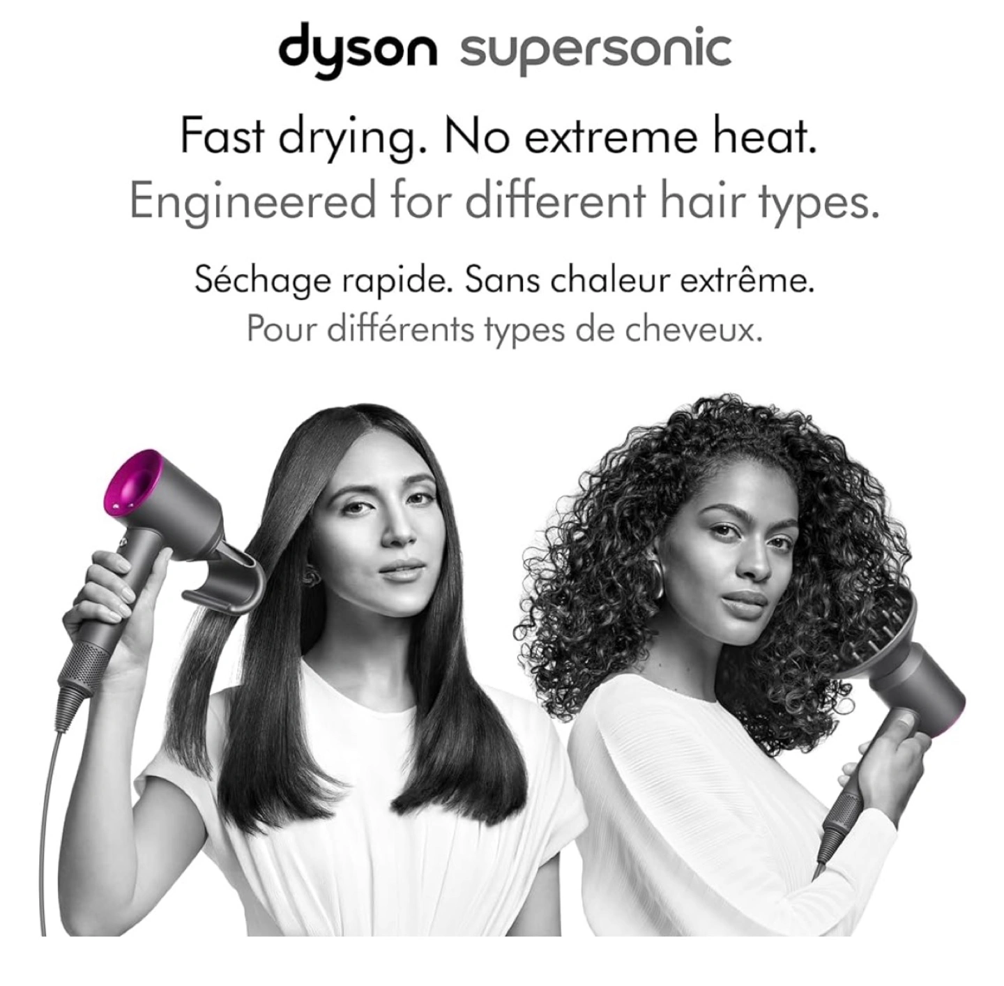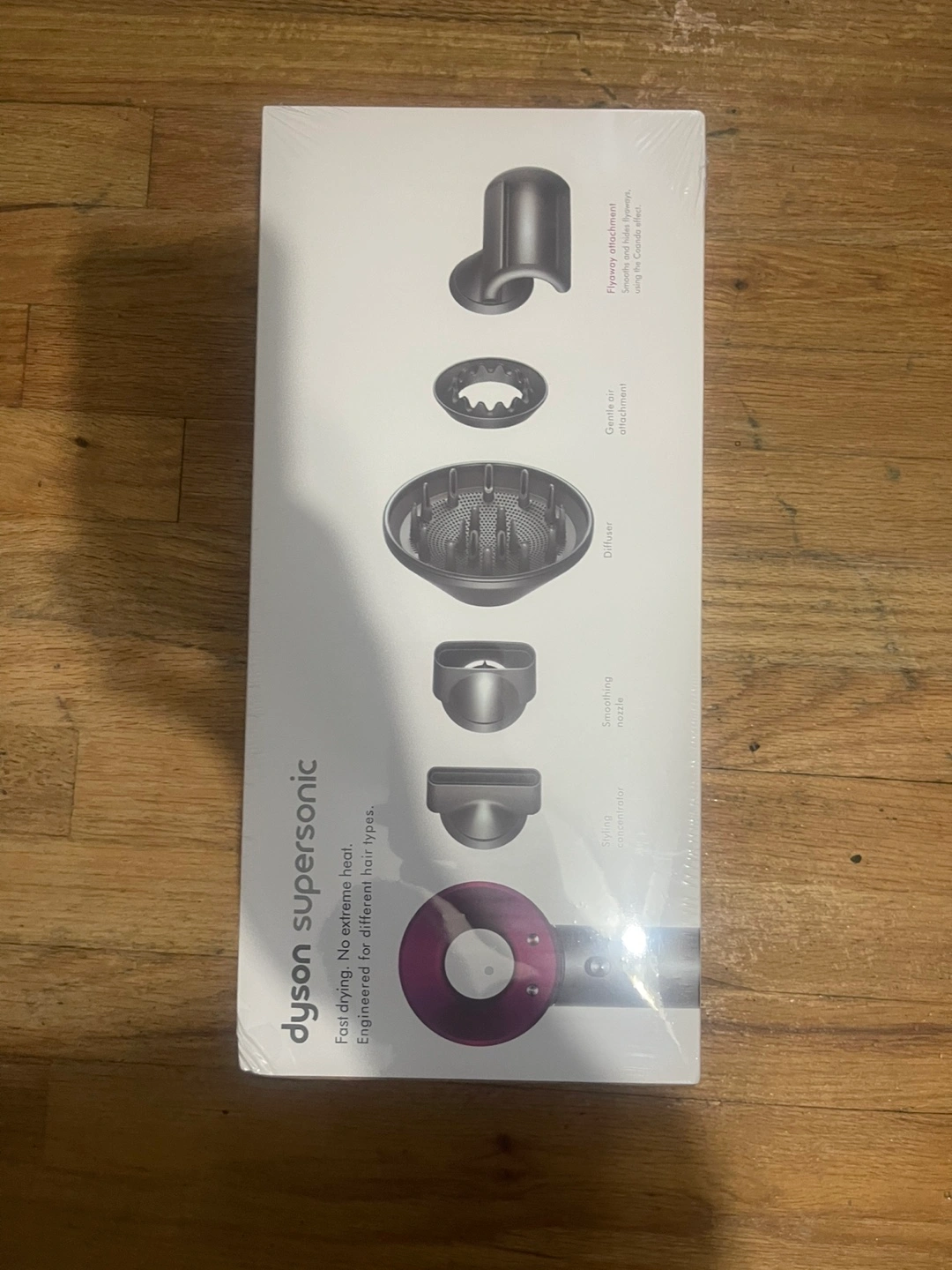 New Dyson Supersonic hair dryer. Includes multiple attachments. Fast drying, engineered for different hair types. No extreme heat.