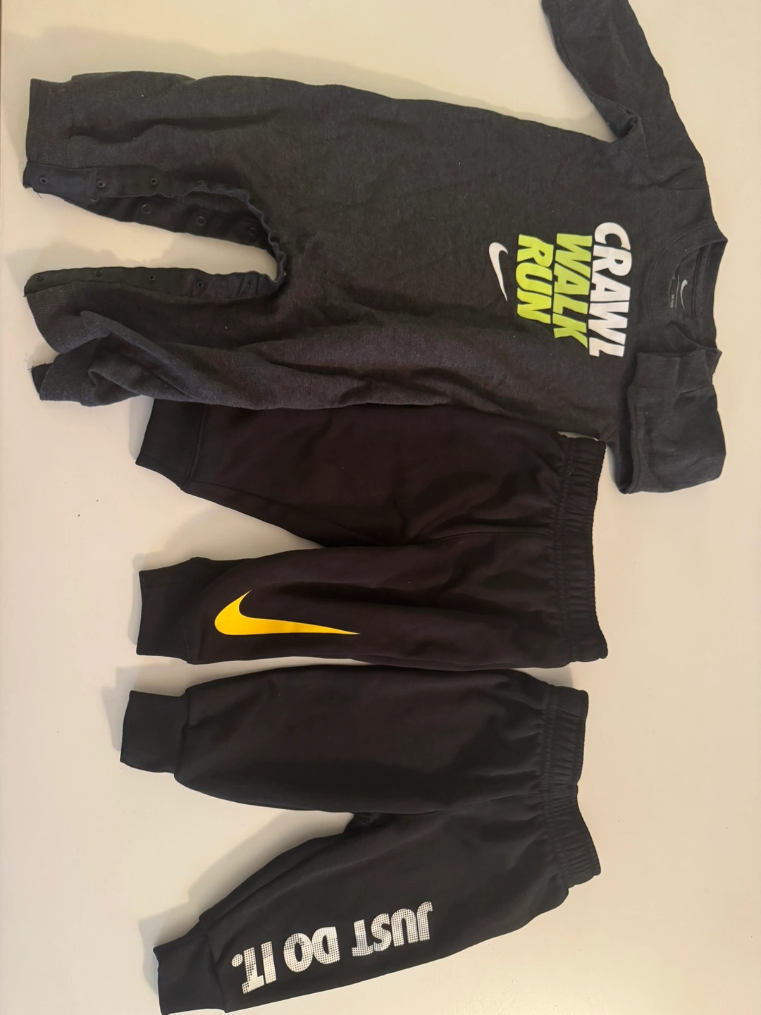 Nike outfits include a long-sleeve onesie with a graphic on the front and two pairs of black pants, one with a yellow swoosh on the leg and the other with a white "Just Do It" graphic on the leg.