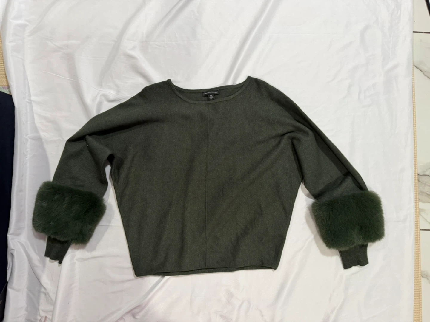 Saks Fifth Avenue sweater in a deep green hue. It features contrasting faux fur cuffs for a touch of luxury. Made in China.