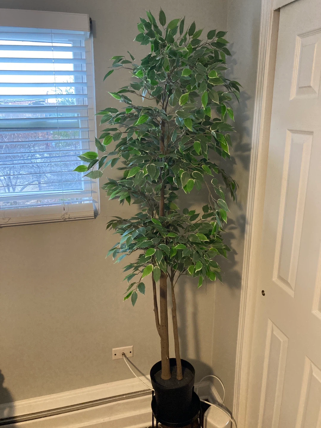 This is an artificial Ficus tree with variegated leaves. It has a realistic appearance with multiple trunks and a black pot. It's great for adding greenery to any indoor space without the need for maintenance.