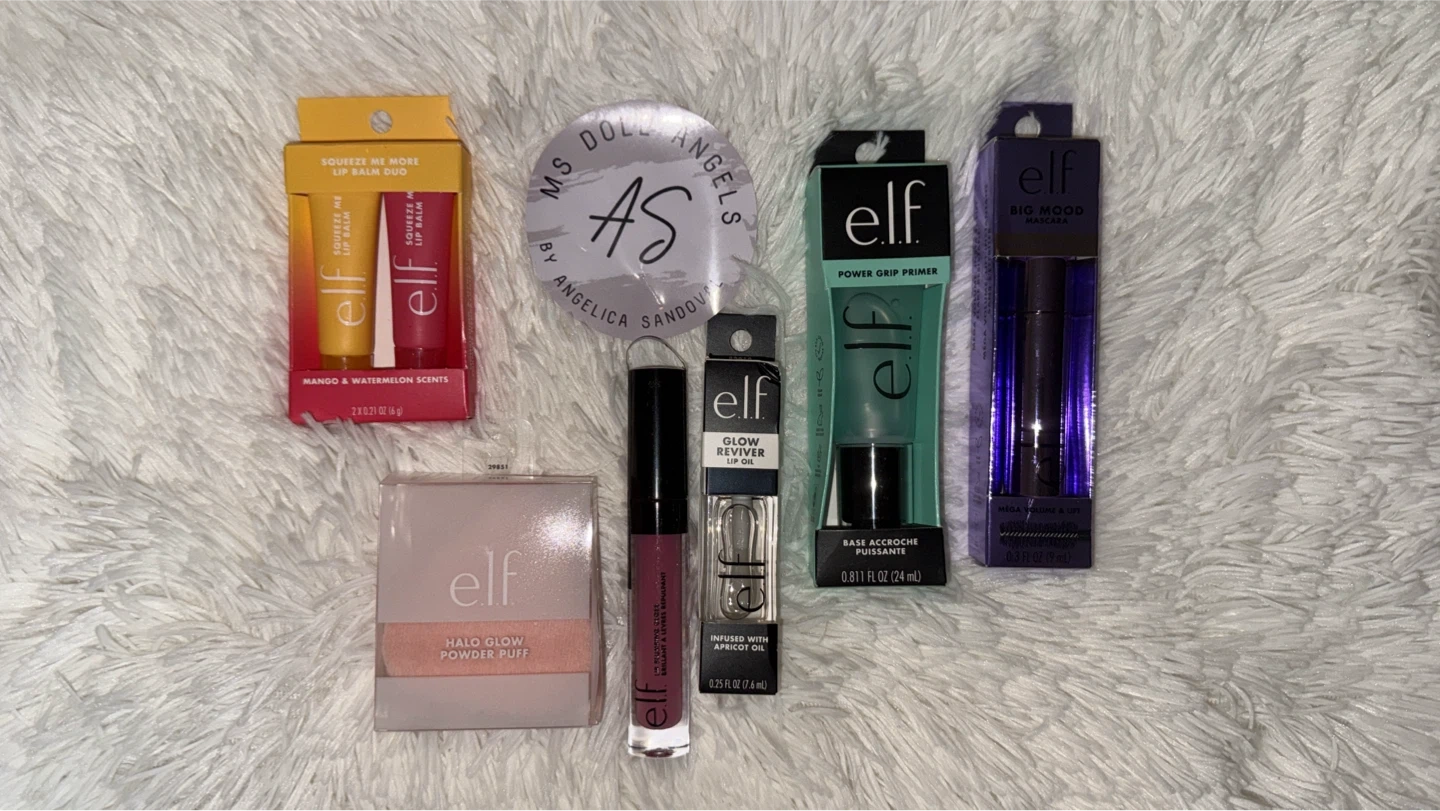 Selling a bundle of e.l.f. cosmetics! Includes: - Squeeze Me More Lip Balm Duo (Mango & Watermelon scents) - Power Grip Primer (0.811 fl oz / 24 mL) - Big Mood Mascara - Halo Glow Powder Puff - Glow Reviver Lip Oil (infused with Apricot Oil, 0.25 fl oz / 7.6 mL)