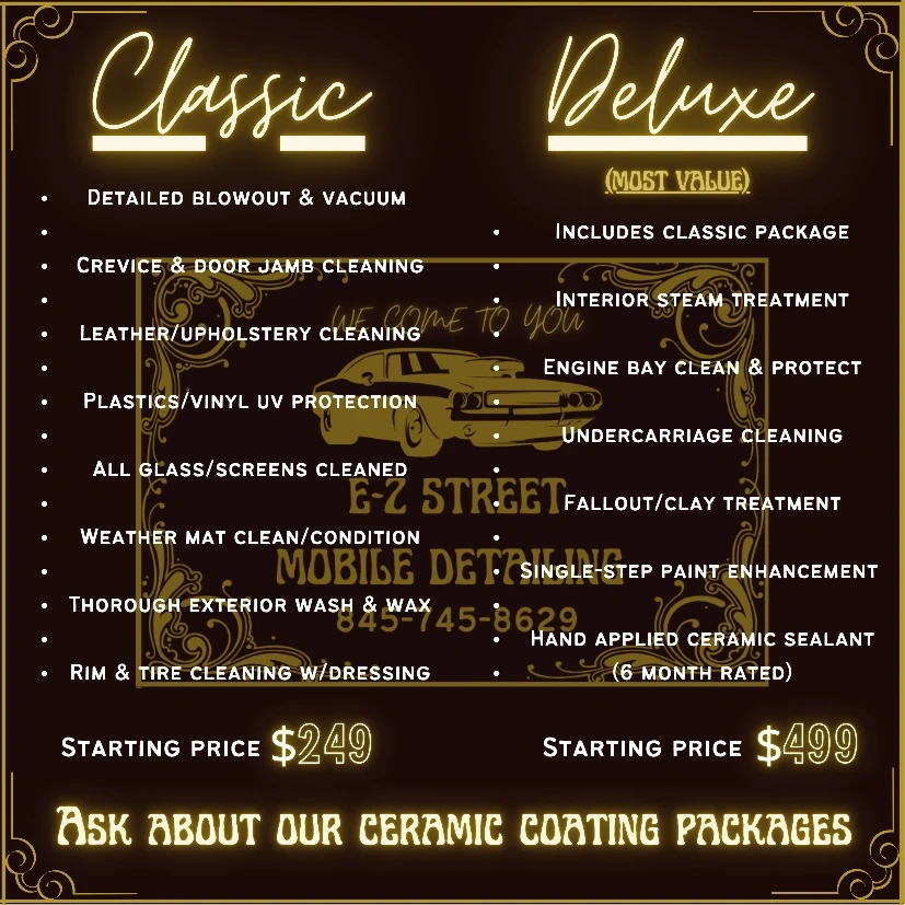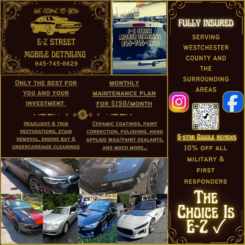 10E-Z Street Mobile Detailing is a premium auto detailing company specializing in mobile ceramic coatings and paint correction. We offer competetive interior/exterior detail packages as well for a showroom shine with added protection all year round. With our 5-star Google rating and the proper knowledge, we are proudly the first choice in Westchester County and the surrounding areas for mobile ceramic coatings and paint correction. Feel free to reach out anytime for pricing and availability. The choice is E-Z✓