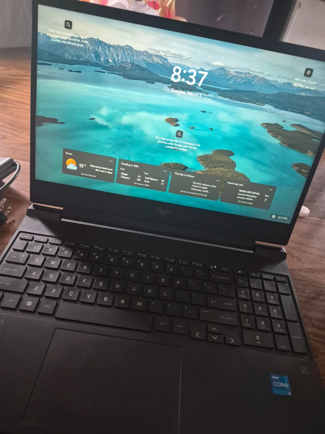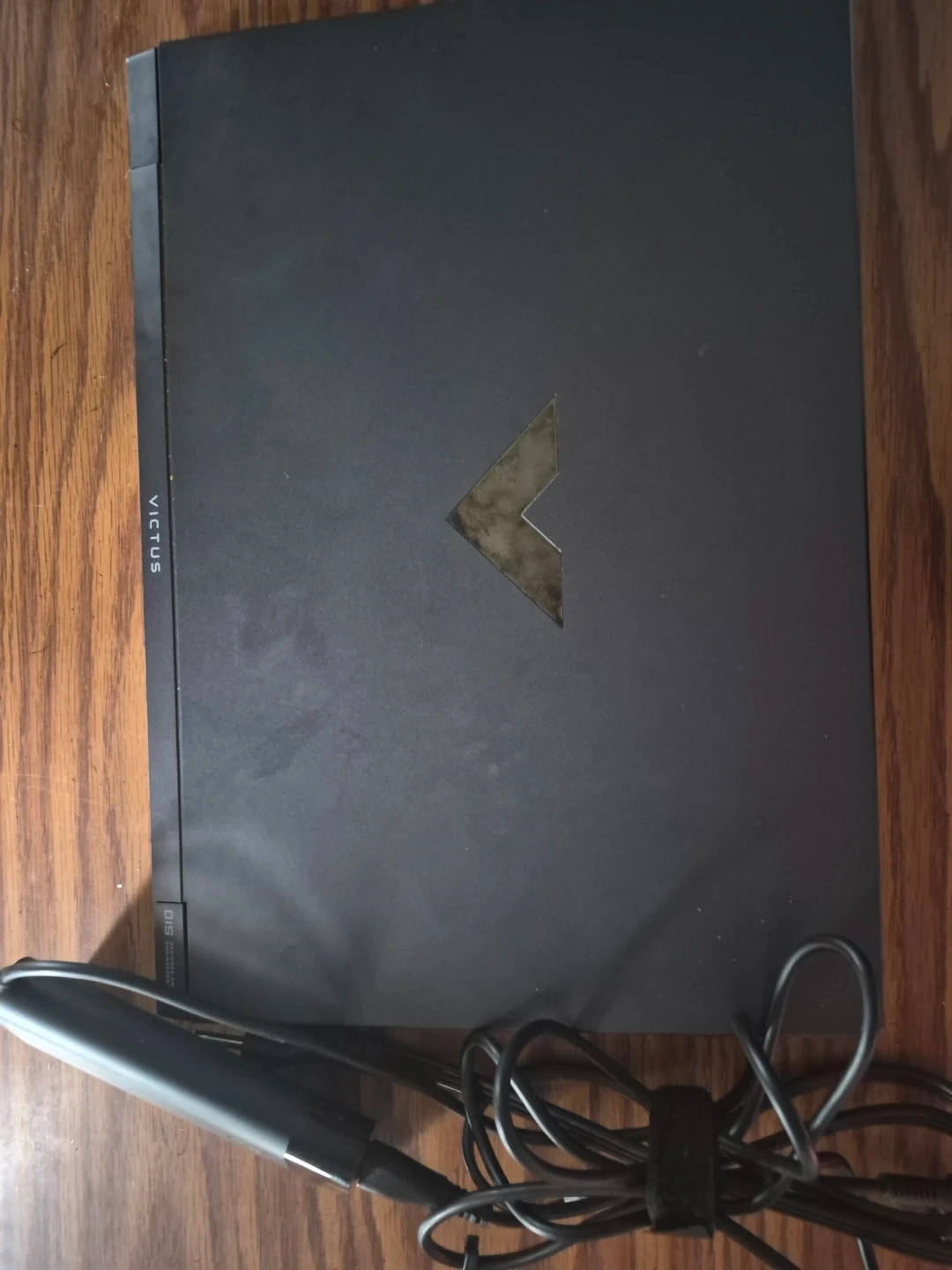 This is a black HP Victus laptop. It features a large screen with a high-resolution display. The keyboard is backlit and includes a numeric keypad. The laptop comes with its power adapter.