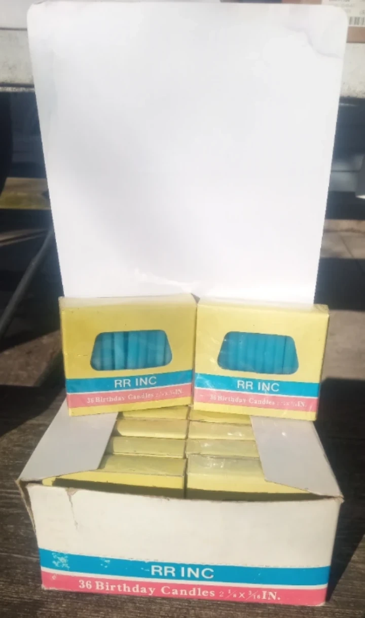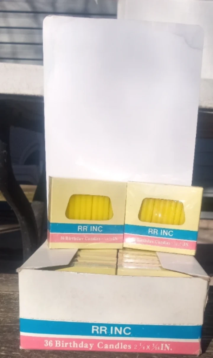 This is two cases of RR Inc. birthday candles. Each contains 12 boxes of 36 candles. One case of 12 is all yellow candles and the second case will be all blue candles. The candles measure 2 1/2 inches long and 3/16 inches in diameter. They're yellow and blue selling a case of each as a set. These are good for a birthday or any celebration!