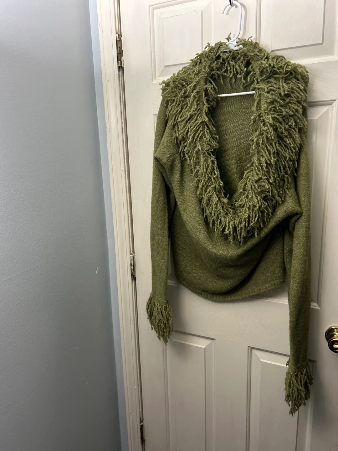 This is a green sweater with a fuzzy, fringe detail around the collar and cuffs. It's a comfortable knit. The style's unique fringe adds a fun touch!
