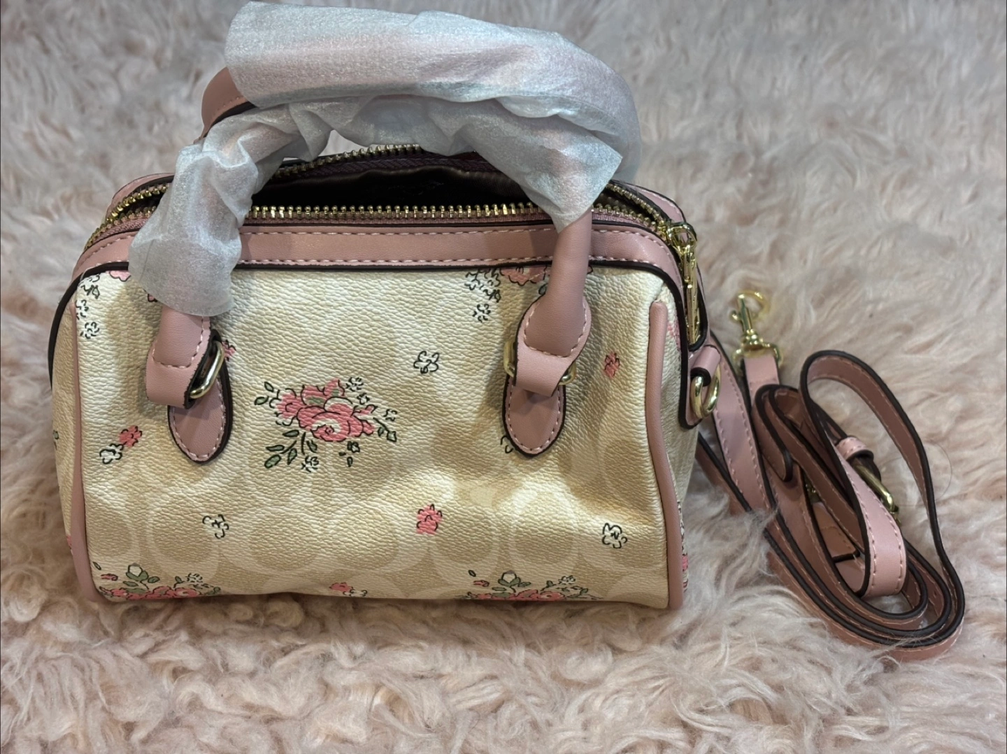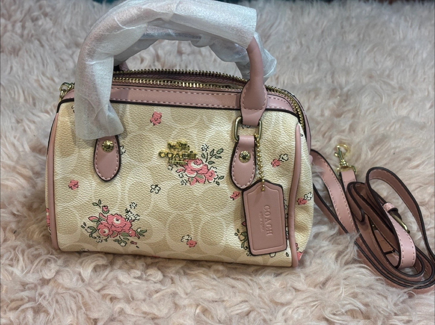 Selling a cute Coach Mini Rowan Satchel with a floral print! It's in great condition and comes with a detachable strap. Perfect for adding a touch of elegance to your outfit!