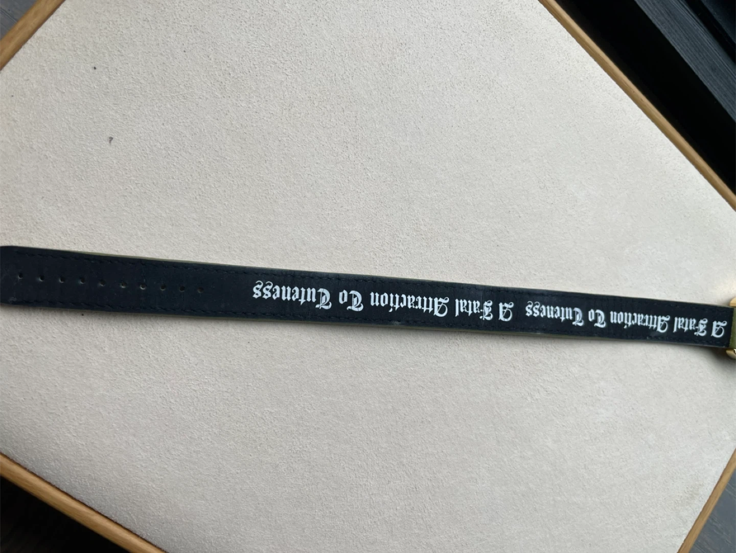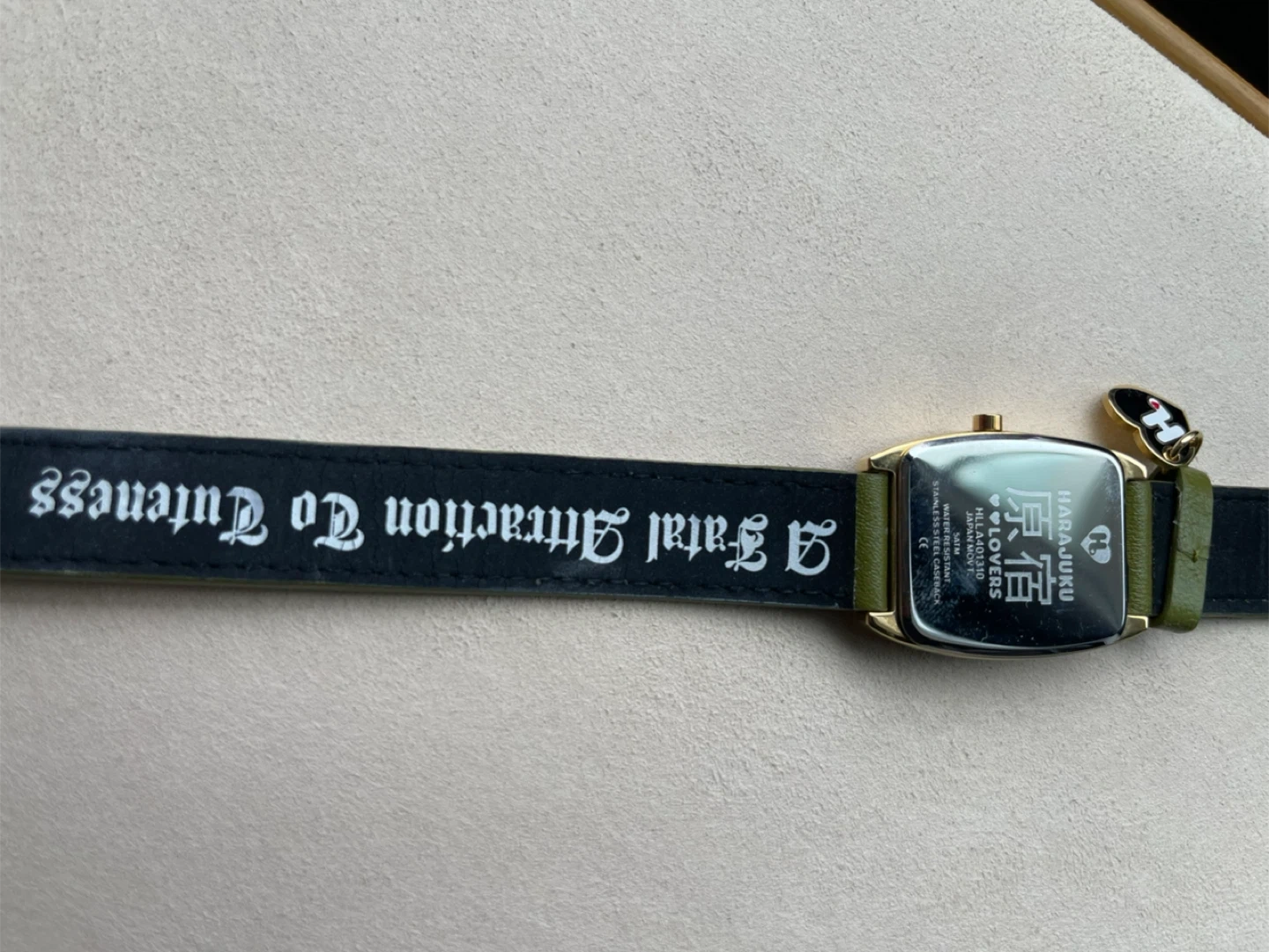 Mint condition wraparound watch from Gwen Stefani’s Harajuku Lovers line (lyrics from „Harajuku Girls” song appear on the inside and outside of the band). Will best fit a very small to medium wrist. Comes with original box. Requires a replacement battery.