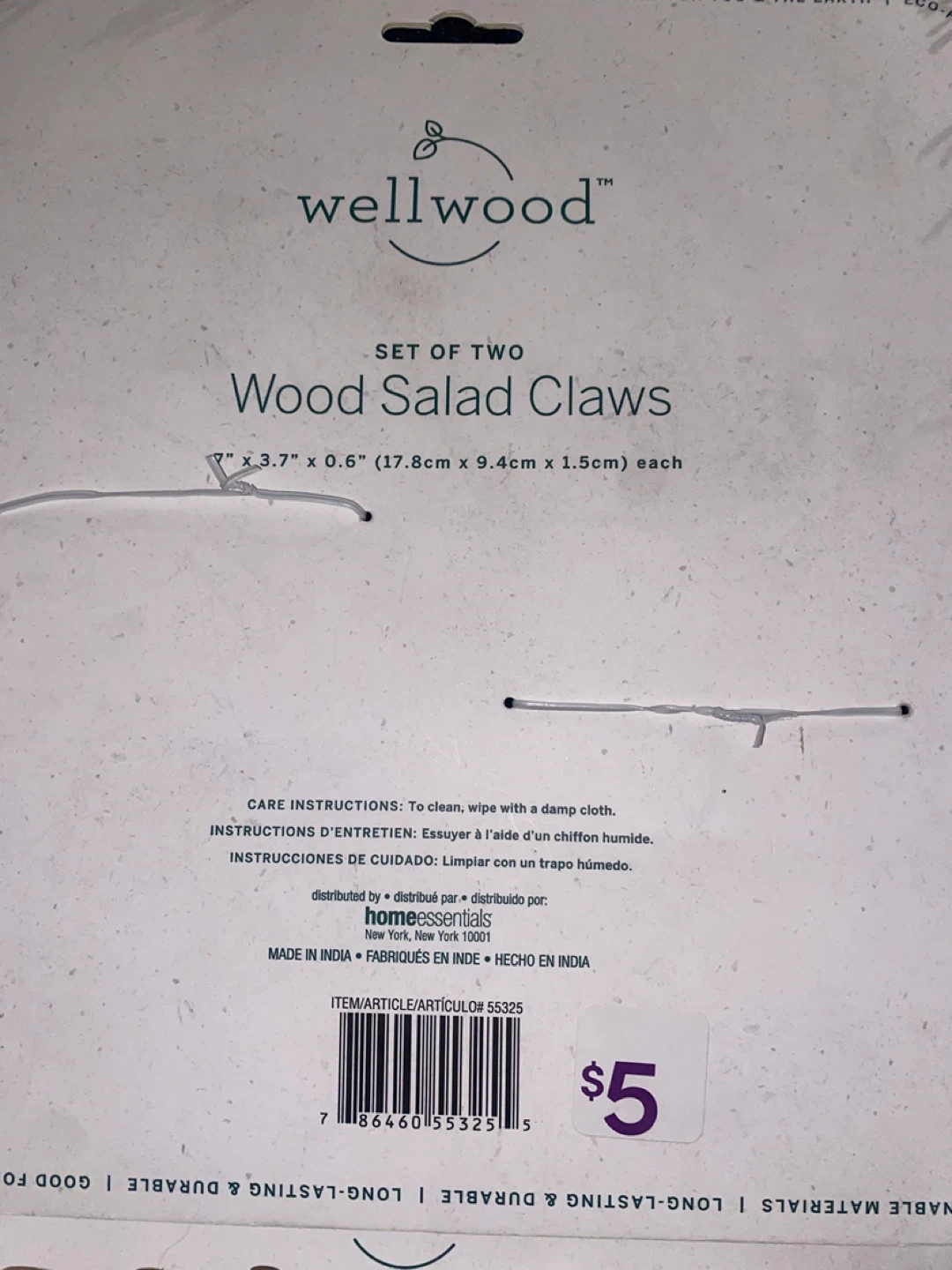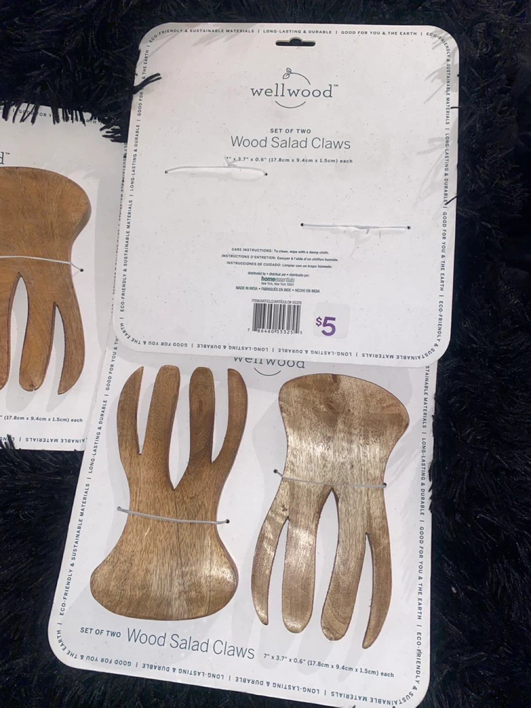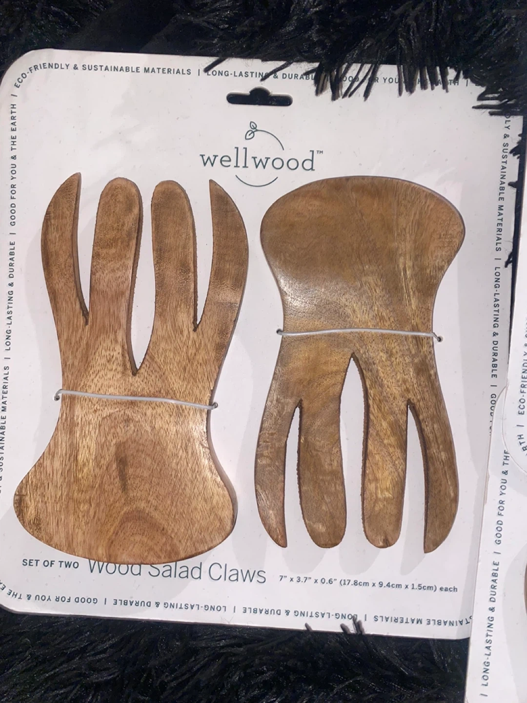 This is a set of two Wellwood wood salad claws. Each claw measures 7" x 3.7" x 0.6" (17.8cm x 9.4cm x 1.5cm). They're made from wood. These are great for tossing salads!