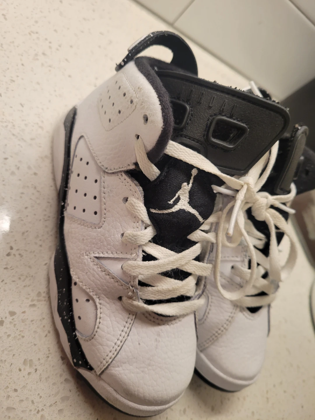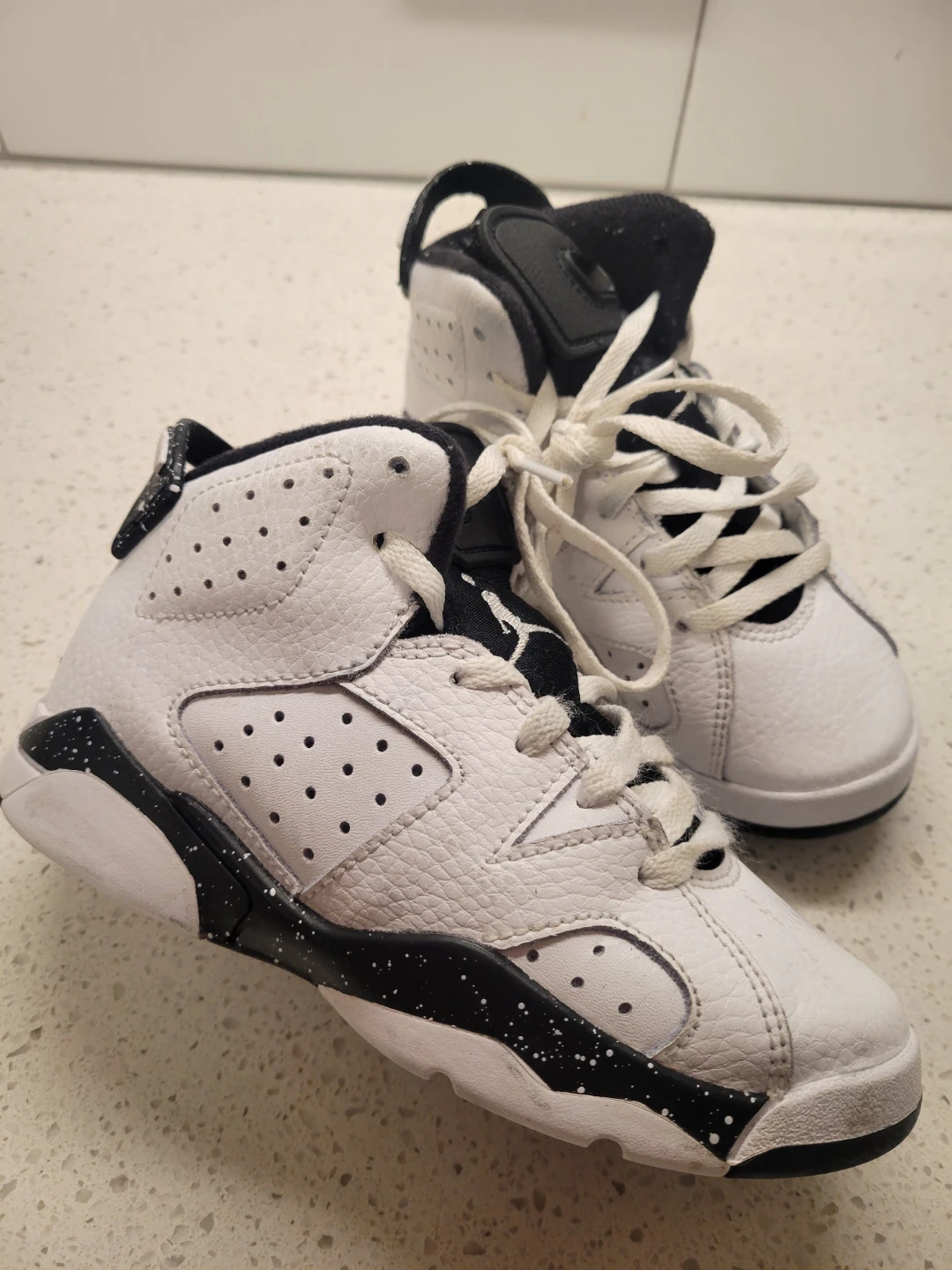 Toddler sized Air Jordan 6 Retro shoes in a white, black, and speckled colorway. Leather upper with lace-up closure. These are classic sneakers perfect for little ones.