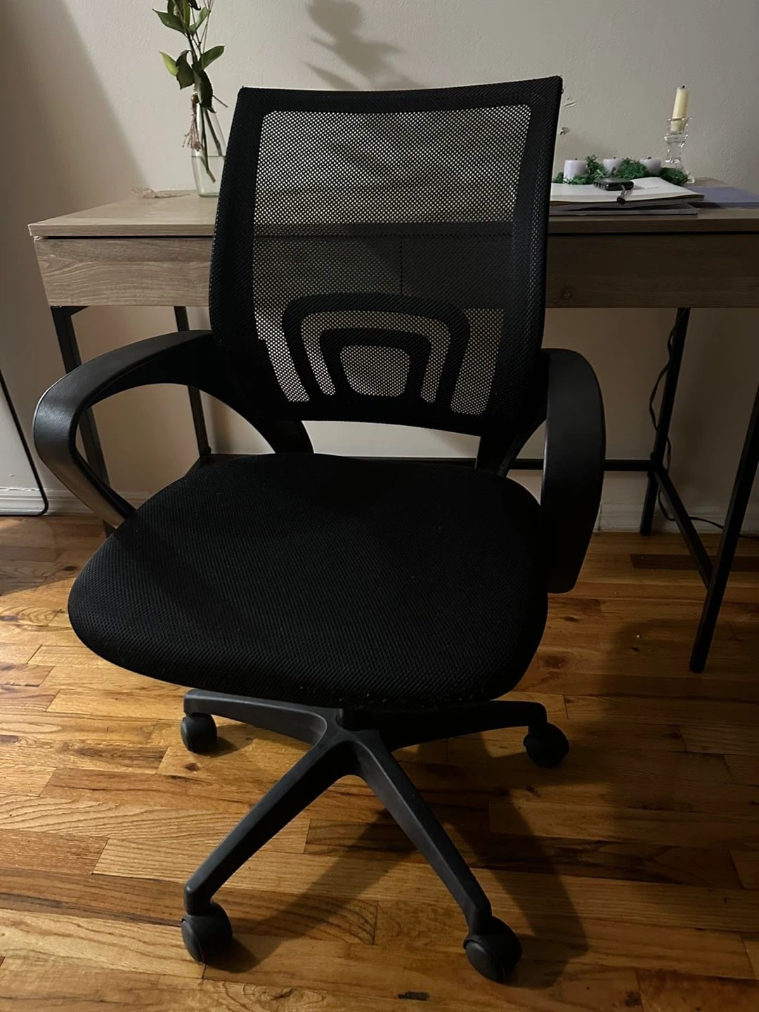 This is a black mesh office chair with a padded seat. It features a five-star base with casters for easy mobility. The mesh back provides breathability. It's suitable for home or office use.