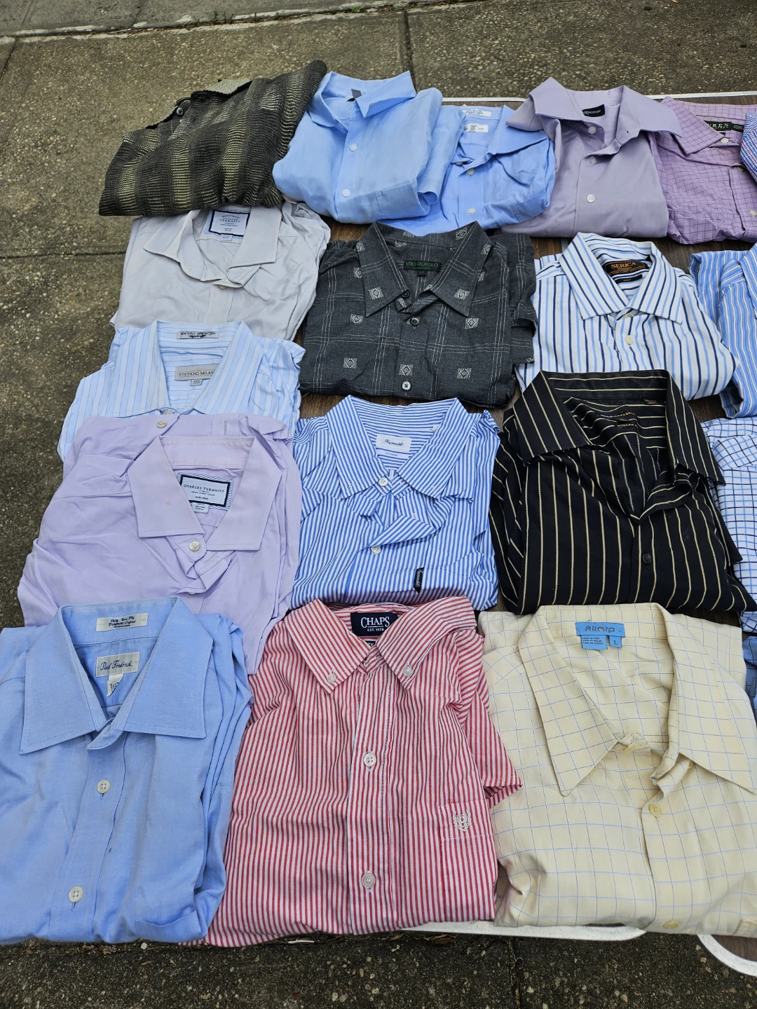 25 used brand name shirts. Size large. Some slim some regular fit. 16.5 neck.