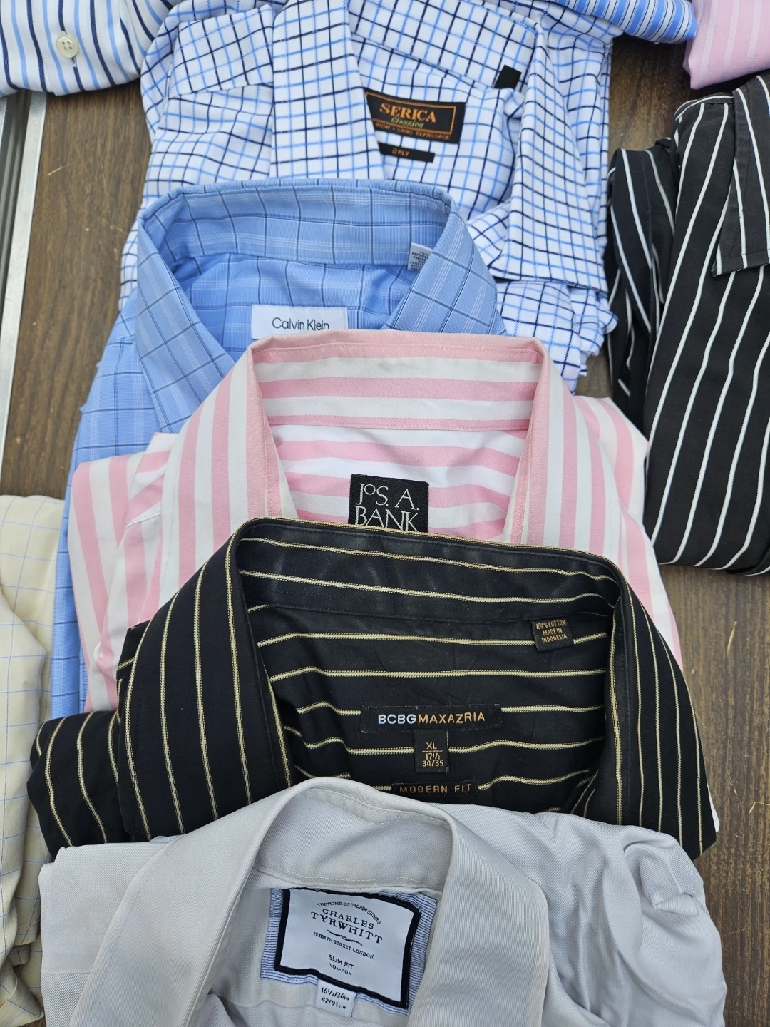 Brand name calvin klein, BCBG, EXPRESS, JOS A BANK, CHARLES TYRWHITT, and other brands. These were selling between $80-$120 each.. 25 for $100 great price! Only $4 each when taking all. Final price