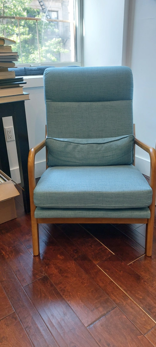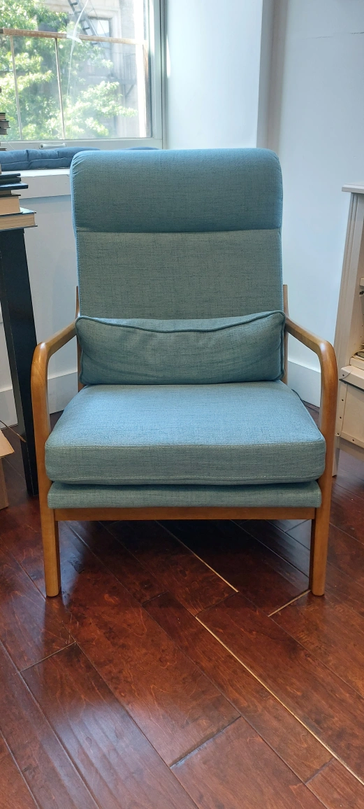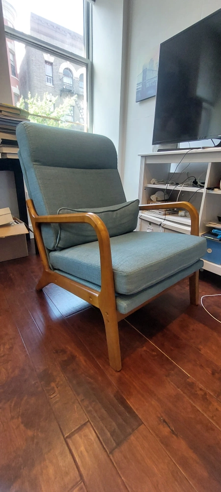 This is a comfortable armchair with a light blue fabric and a wooden frame. It comes with a matching lumbar pillow. It's in great condition and would be a great addition to any living room or bedroom!