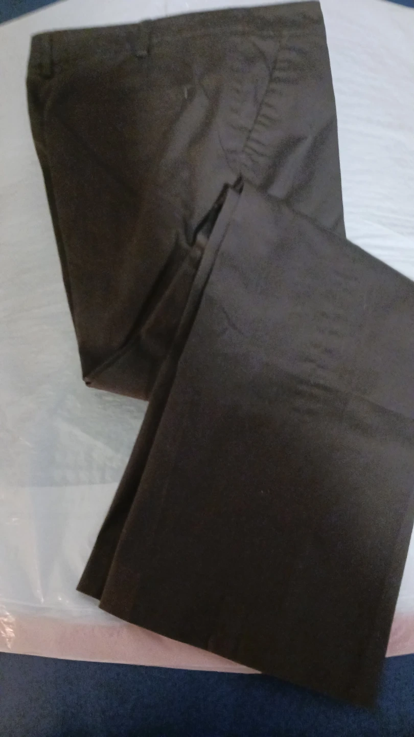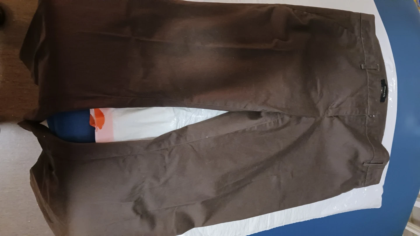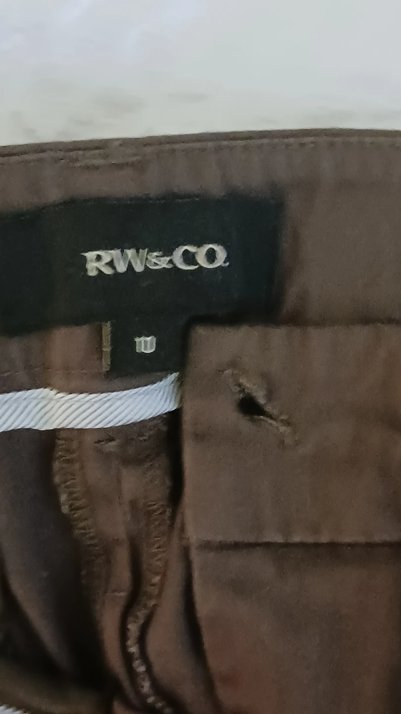 These are RW & CO. brown dress pants. They're a size 10. Material is a cotton blend. These pants are a versatile addition to any wardrobe!